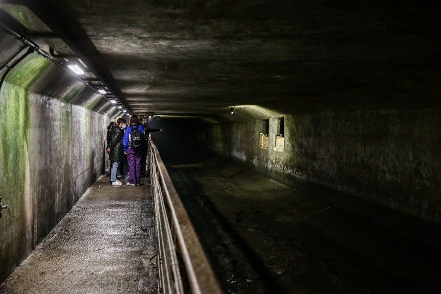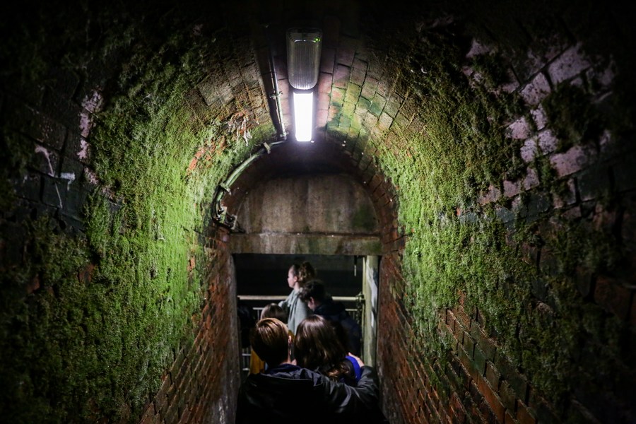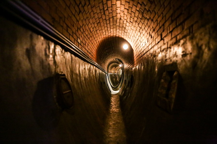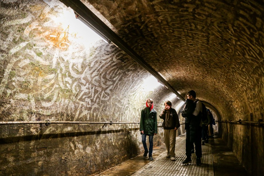 Visitors walk through a sewer at Sewer Museum in Brussels, Belgium, on May 16, 2023. (Xinhua/Zheng Huansong)
