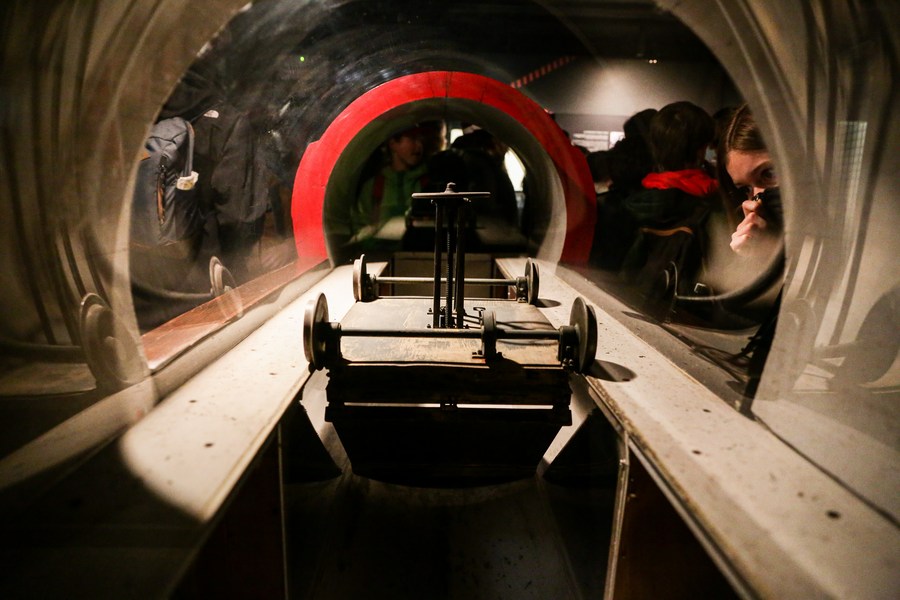 A visitor looks at a model used for cleaning a sewer at Sewer Museum in Brussels, Belgium, on May 16, 2023. (Xinhua/Zheng Huansong)
