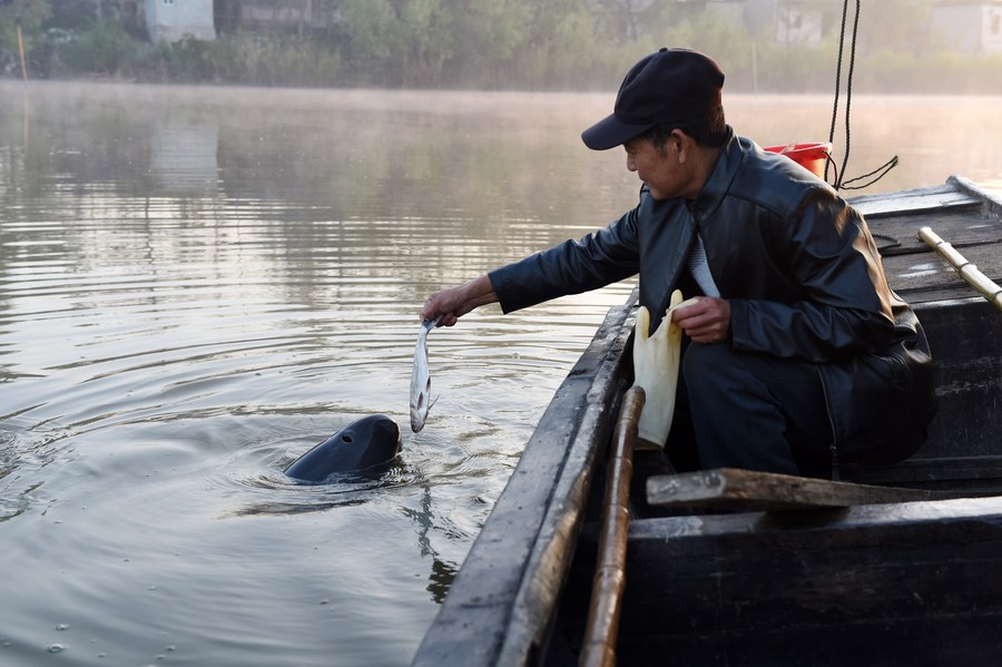 A breeder feeds a Yangtze finless porpoise in the Tongling Freshwater Dolphins National Nature Reserve in Tongling, east China's Anhui Province, Nov. 11, 2020. (Xinhua/Zhou Mu)