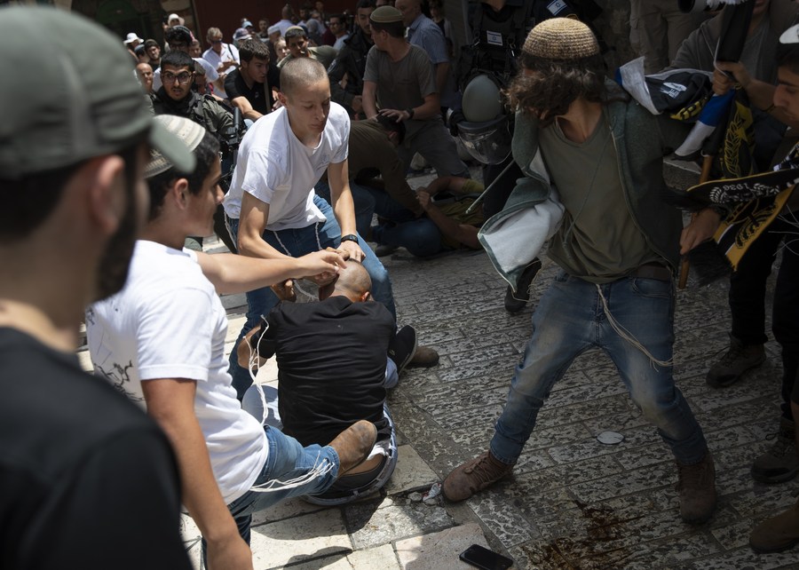 Israeli participants in the Flag March clash with Palestinians in Jerusalem, on May 18, 2023. (Photo by Chen Junqing/Xinhua)