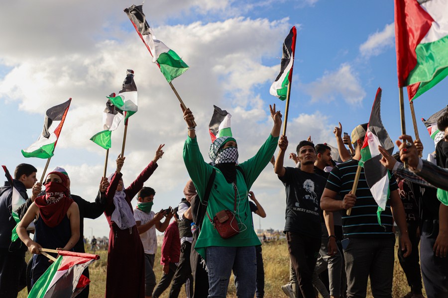 Palestinians hold a demonstration in response to the Israeli Flag March, in the eastern Gaza city, on May 18, 2023. (Photo by Rizek Abdeljawad/Xinhua)