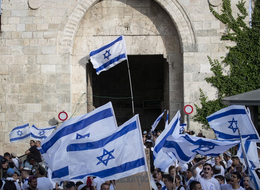 Israeli participants in the Flag March march through the Damascus Gate to the Old City of Jerusalem, on May 18, 2023. (Photo by Chen Junqing/Xinhua)