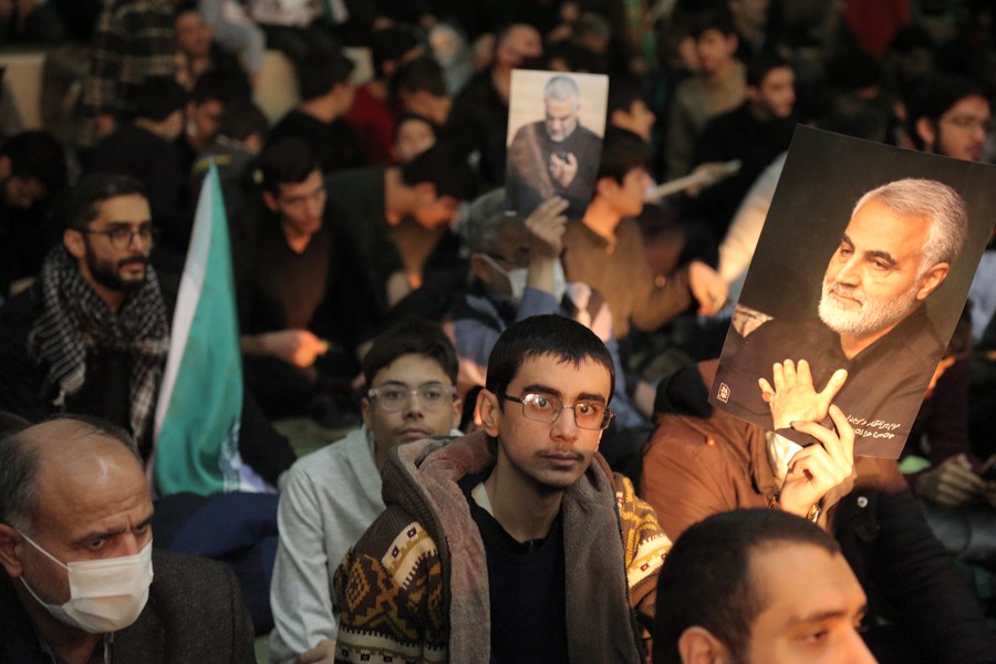 People attend a ceremony marking the 3rd anniversary of former Iranian commander Qassem Soleimani's assassination in Tehran, Iran, on Jan. 3, 2023. (Xinhua/Gao Wencheng)