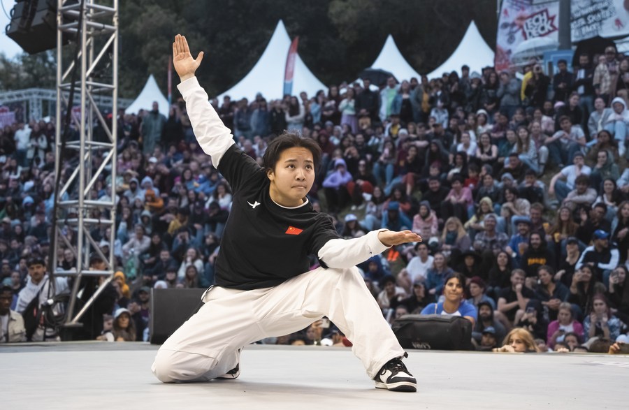 China's Liu Qingyi (B-Girl 671) performs during the final against Lithuania's Dominika Banevic (B-Girl Nicka) at the third stop of World Dance Sport Federation (WDSF) Breaking for Gold (BFG) World Series in Montpellier, France, on May 18, 2023. (Xinhua/Xiao Yazhuo)