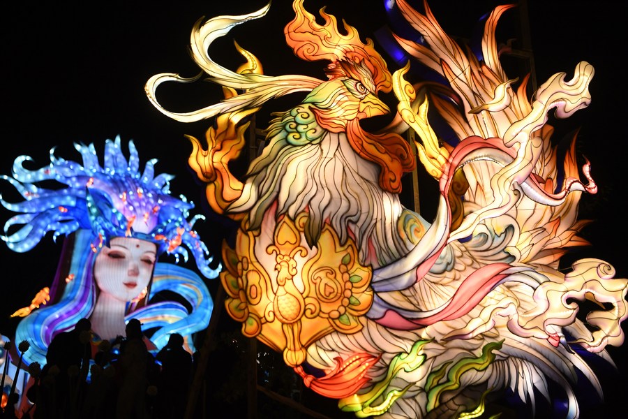 Light installations are pictured during a lantern exhibition at the Hekou ancient town in Xigu District of Lanzhou, northwest China's Gansu Province, May 19, 2023. Featuring the theme of Hekou ancient town and the Silk Road, the lantern exhibition will last until the end of October. (Xinhua/Chen Bin)