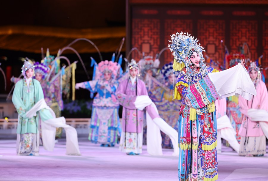 Artists perform during an art performance which marks the opening of the year of culture and art of the peoples of China and Central Asia as well as the China-Central Asia youth arts festival in the Tang Paradise in Xi'an, northwest China's Shaanxi Province, May 18, 2023. (Xinhua/Liu Bin)