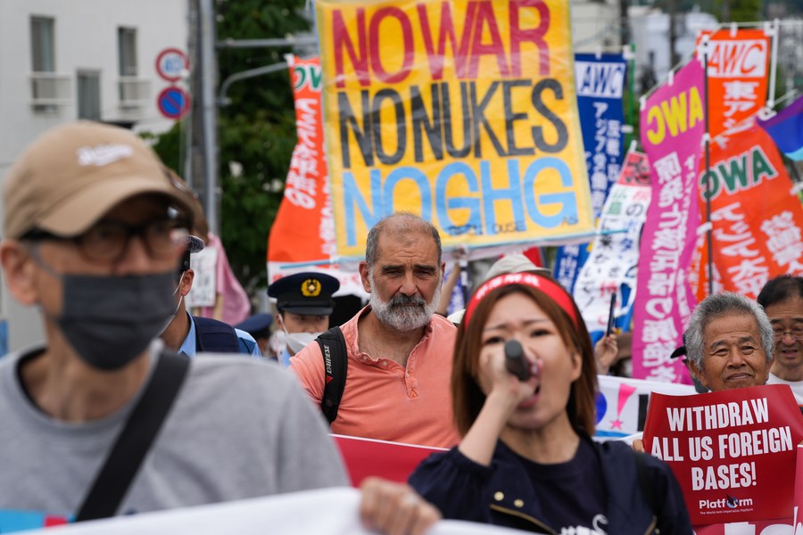 People rally in a protest against the Group of Seven (G7) summit in Hiroshima, Japan, May 19, 2023. Amid waves of protests, the G7 leaders' annual summit got underway in Hiroshima on Friday. (Xinhua/Zhang Xiaoyu)