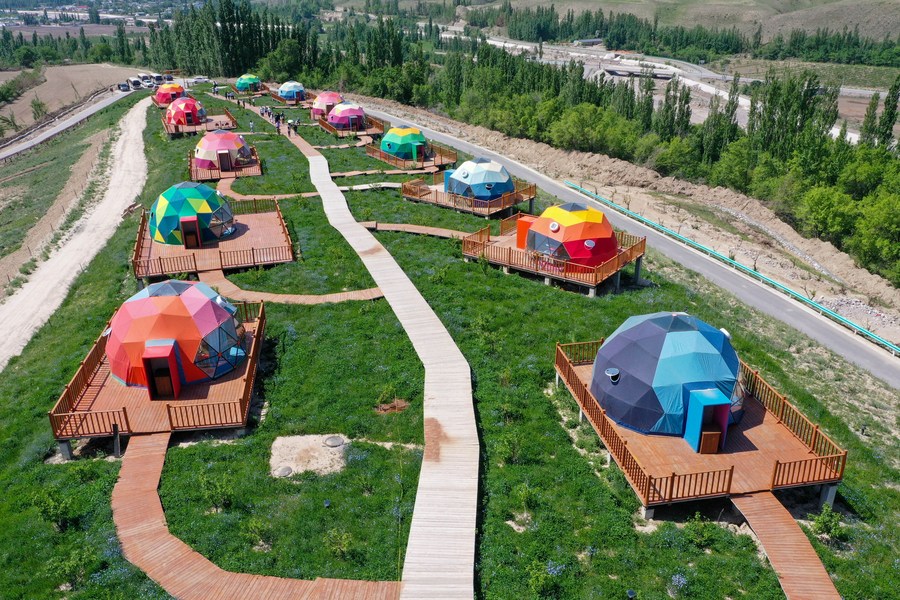 This aerial photo taken on May 17, 2023 shows a homestay ready to be put into use in Taohua Village, Ili Kazak Autonomous Prefecture, northwest China's Xinjiang Uygur Autonomous Region. Ili Kazak Autonomous Prefecture has developed flowers sightseeing economy in recent years, which boosts the local tourism, attracts lots of visitors and increases the income of local people. (Xinhua/Ding Lei)