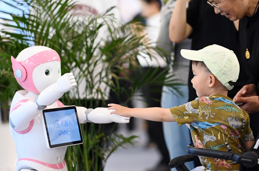 A child interacts with a robot at an intelligent technology exhibition during the seventh World Intelligence Congress (WIC) in north China's Tianjin, May 19, 2023. The seventh WIC, a major AI event in China, kicked off in the northern Tianjin Municipality on Thursday. (Xinhua/Zhao Zishuo)