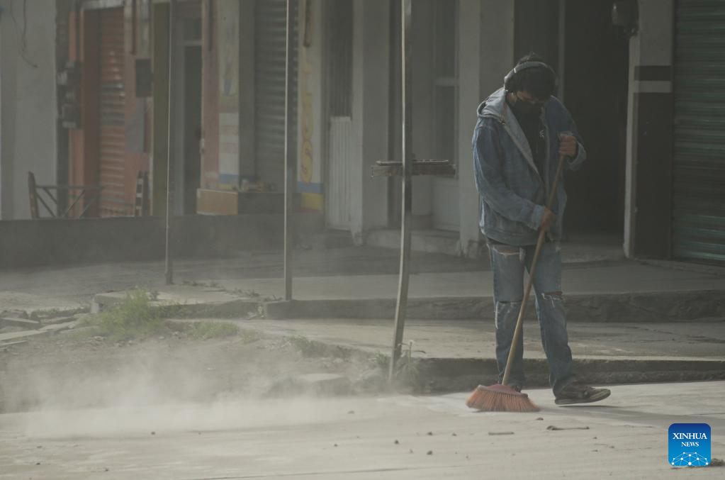A man sweeps ash caused by the activity of the Popocatepetl volcano in the state of Puebla, Mexico, on May 22, 2023. Mexican authorities on Sunday raised the alert level due to the recent increased activity of Popocatepetl volcano.