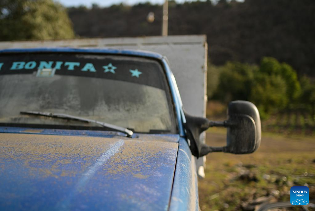 This photo taken on May 22, 2023 shows a vehicle covered in ash caused by the activity of the Popocatepetl volcano in the state of Puebla, Mexico. Mexican authorities on Sunday raised the alert level due to the recent increased activity of Popocatepetl volcano.