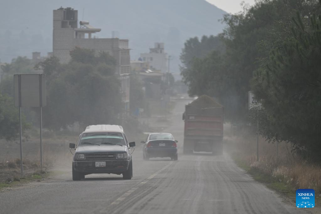 This photo taken on May 22, 2023 shows vehicles passing through ash caused by the activity of the Popocatepetl volcano in the state of Puebla, Mexico. Mexican authorities on Sunday raised the alert level due to the recent increased activity of Popocatepetl volcano.