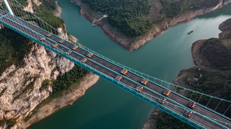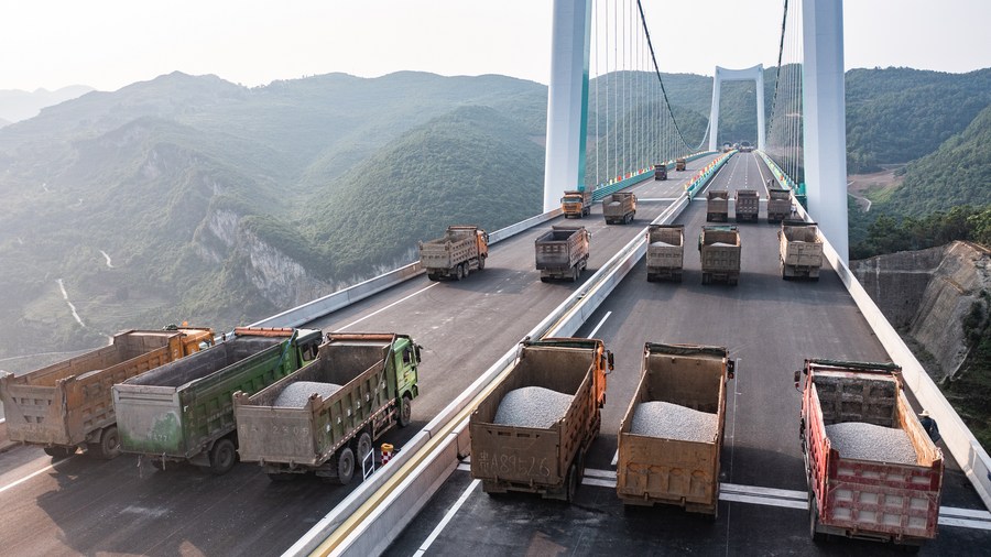 This aerial photo taken on May 21, 2023 shows the Jinfeng Wujiang River Bridge under static load testing in southwest China's Guizhou Province. (Xinhua/Tao Liang)