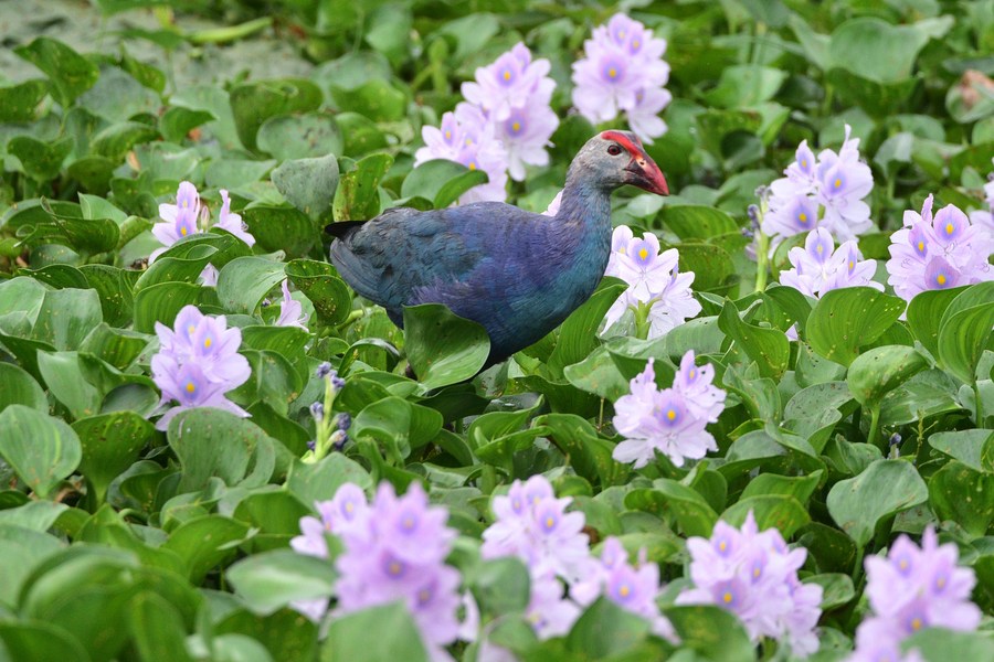 A purple moorhen is seen at Pobitora Wildlife Sanctuary in Morigaon district of India's northeastern state of Assam, May 21, 2023. (Str/Xinhua)