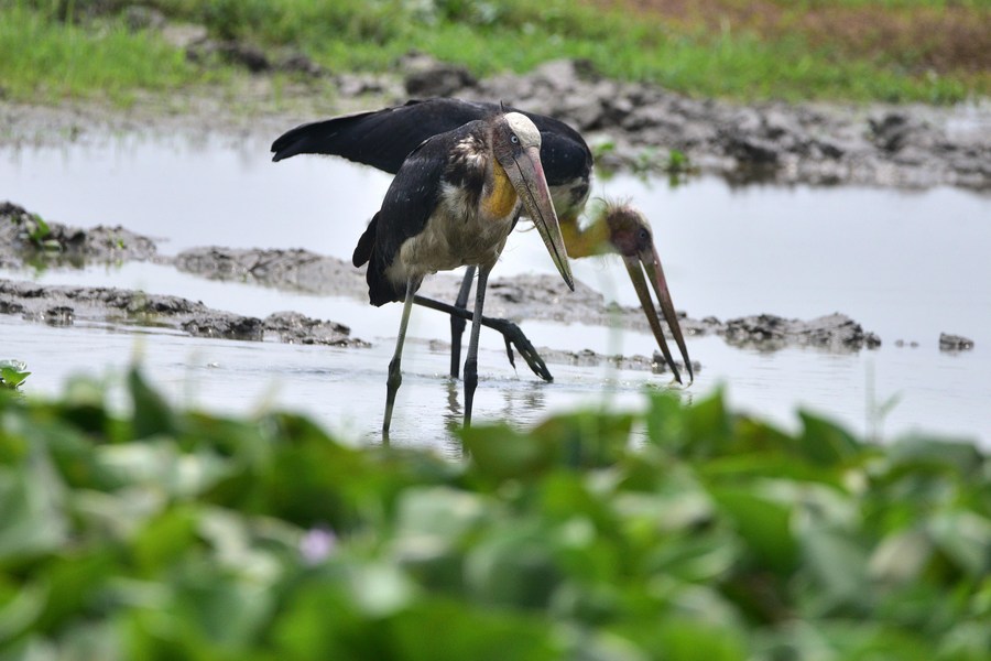 A pair of lesser adjutant storks are seen searching for food at Pobitora Wildlife Sanctuary in Morigaon district of India's northeastern state of Assam, May 21, 2023. (Str/Xinhua)■