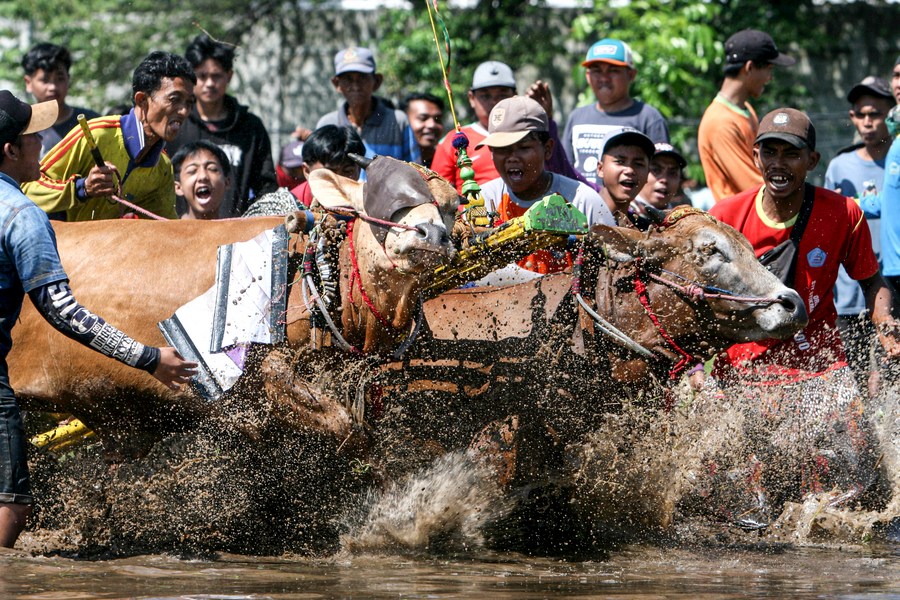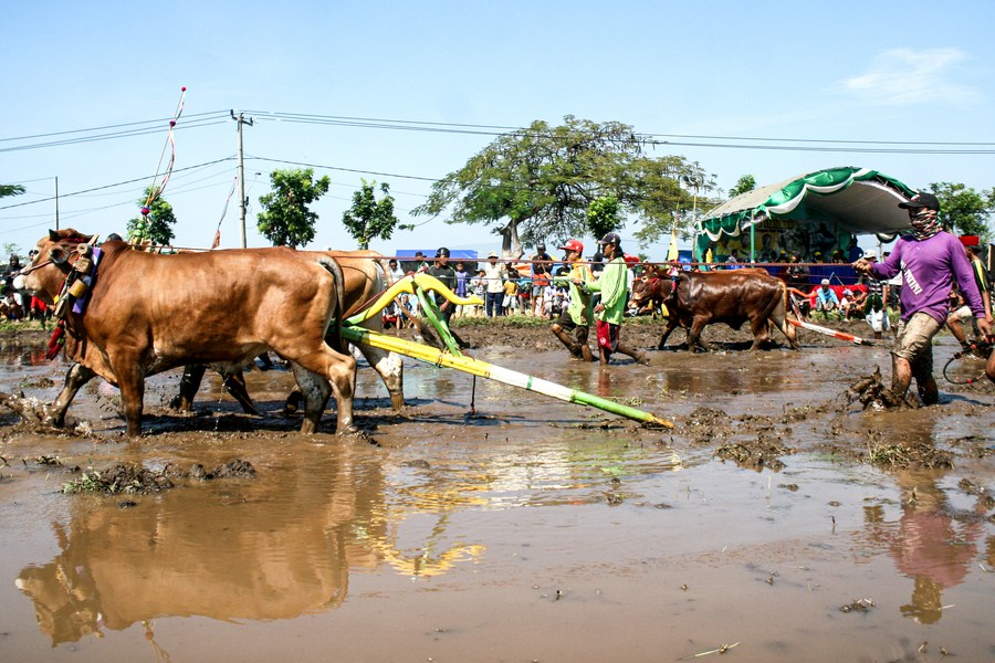 People attend Karapan Sapi Brujul, a traditional bull racing event, in Probolinggo, Indonesia, on May 21, 2023. (Photo by Sahlan Kurniawan/Xinhua) ■