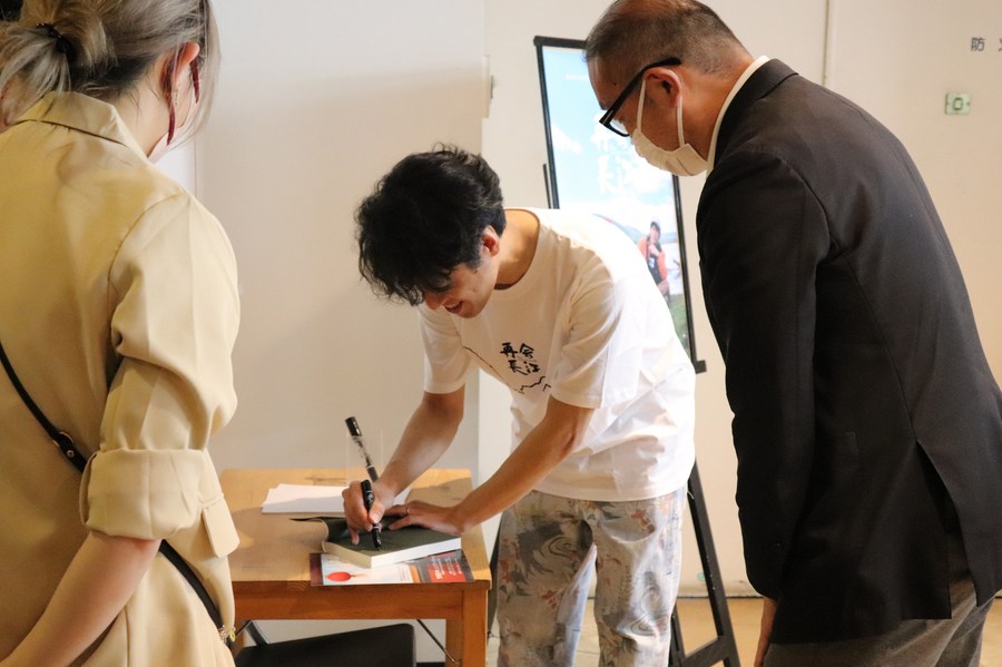 Japanese director Ryo Takeuchi signs autograph for film viewers at the premiere of his documentary "The Yangtze River," in Tokyo, Japan, May 19, 2023. (Xinhua/Yang Guang)