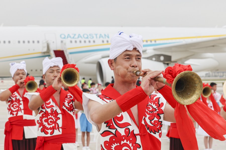 Shaanxi folk artists perform during a welcoming ceremony for leaders of the Central Asian countries in Xi'an, northwest China's Shaanxi Province, on May 17, 2023. (Xinhua/Xing Guangli)