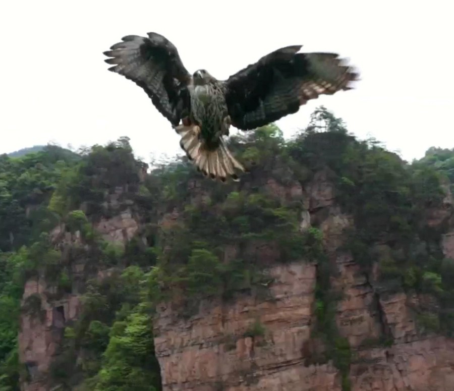 This screenshot shows a raptor attacking a drone in the Jiutianfenglian scenic area in Zhangjiajie City, central China's Hunan Province, on May 14, 2023. (Xinhua)