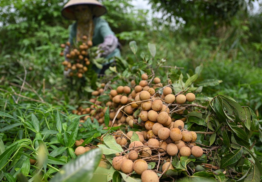 A villager harvests longan fruits at Xianglin vegetable and fruit base in Dongfang City, south China's Hainan Province, April 30, 2023. (Xinhua/Pu Xiaoxu)