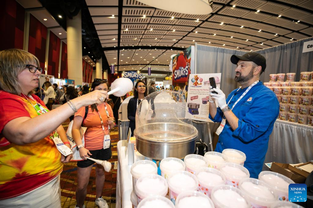 An attendee tries cotton candy at the Sweets and Snacks Expo in Chicago, the United States, on May 23, 2023. The 2023 Sweets and Snacks Expo is held at McCormick Place in Chicago from May 22 to May 25. (Photo by Vincent D. Johnson/Xinhua)