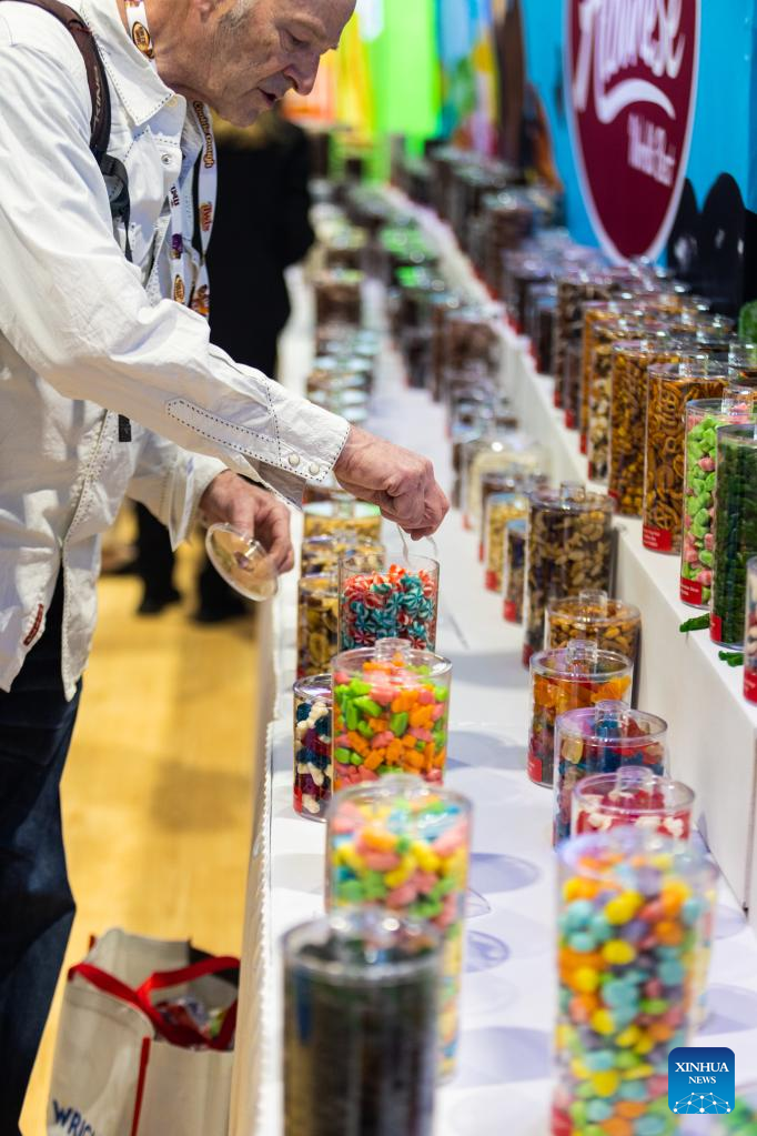An attendee samples candies at a booth at the Sweets and Snacks Expo in Chicago, the United States, on May 23, 2023. The 2023 Sweets and Snacks Expo is held at McCormick Place in Chicago from May 22 to May 25. (Photo by Vincent D. Johnson/Xinhua)