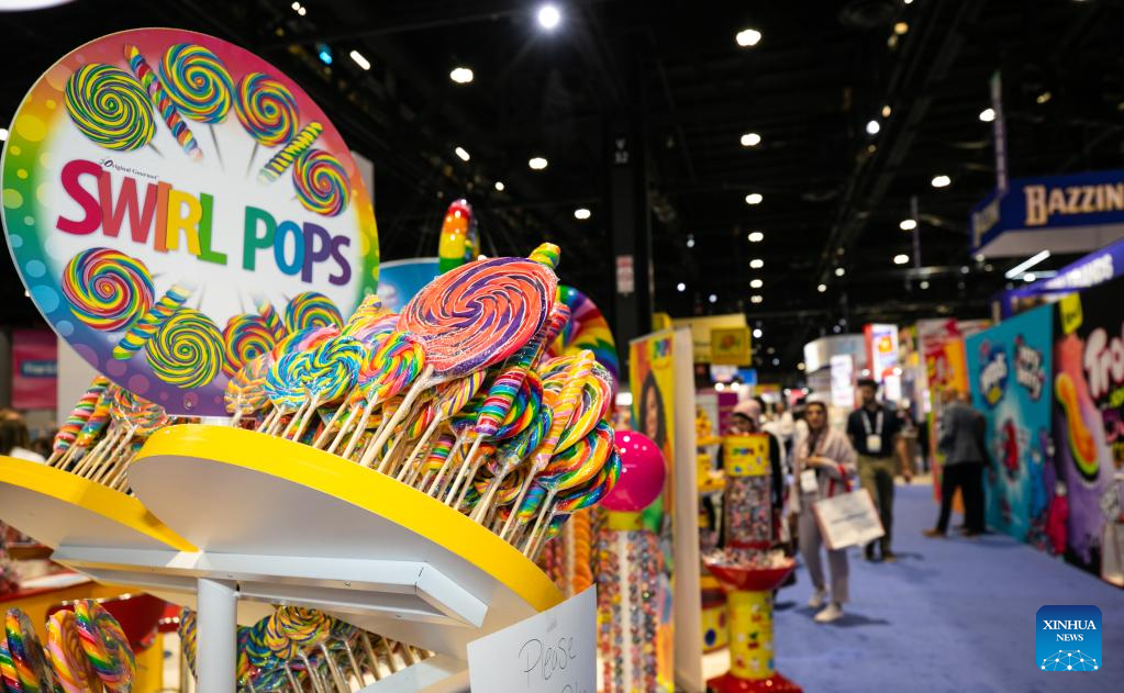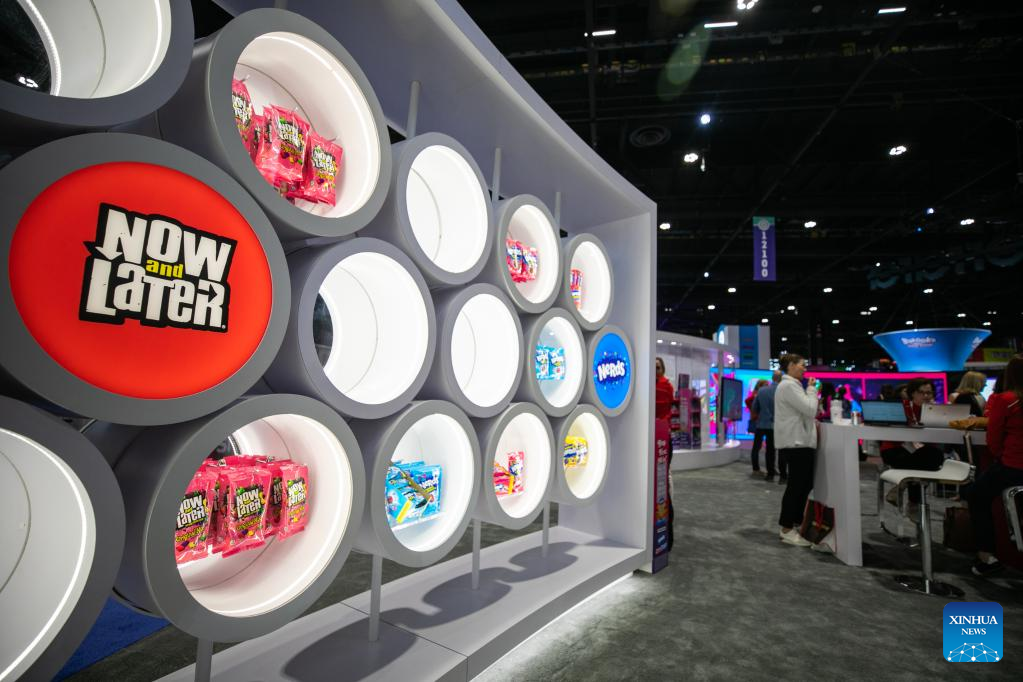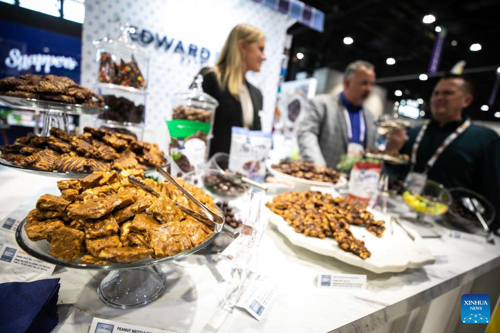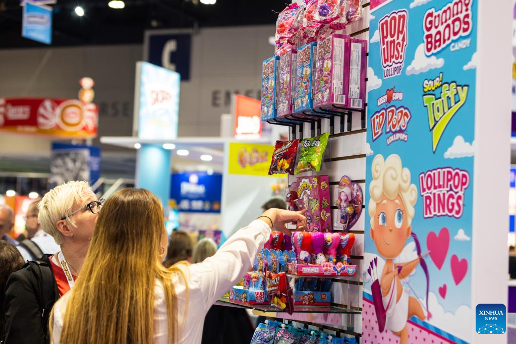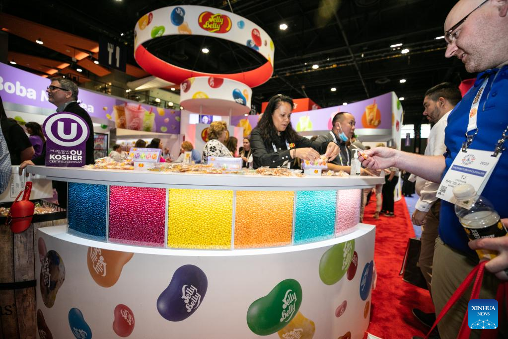 Sweets and snacks are on display at the Sweets and Snacks Expo in Chicago, the United States, on May 23, 2023. The 2023 Sweets and Snacks Expo is held at McCormick Place in Chicago from May 22 to May 25. (Photo by Vincent D. Johnson/Xinhua)