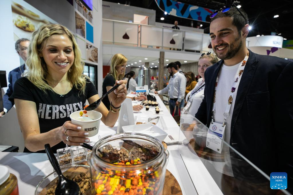 An exhibitor puts some toppings on an ice cream dish for a visitor at the Sweets and Snacks Expo in Chicago, the United States, on May 23, 2023. The 2023 Sweets and Snacks Expo is held at McCormick Place in Chicago from May 22 to May 25. (Photo by Vincent D. Johnson/Xinhua)