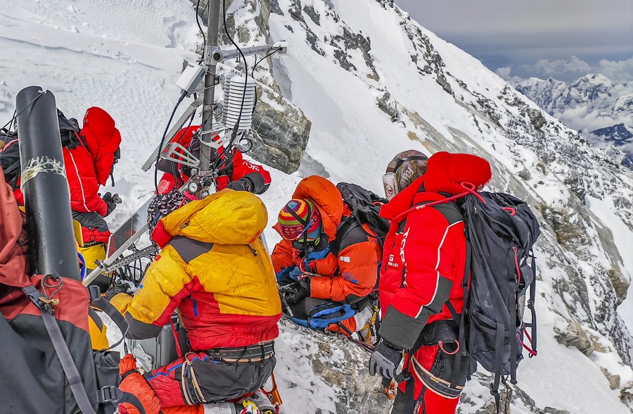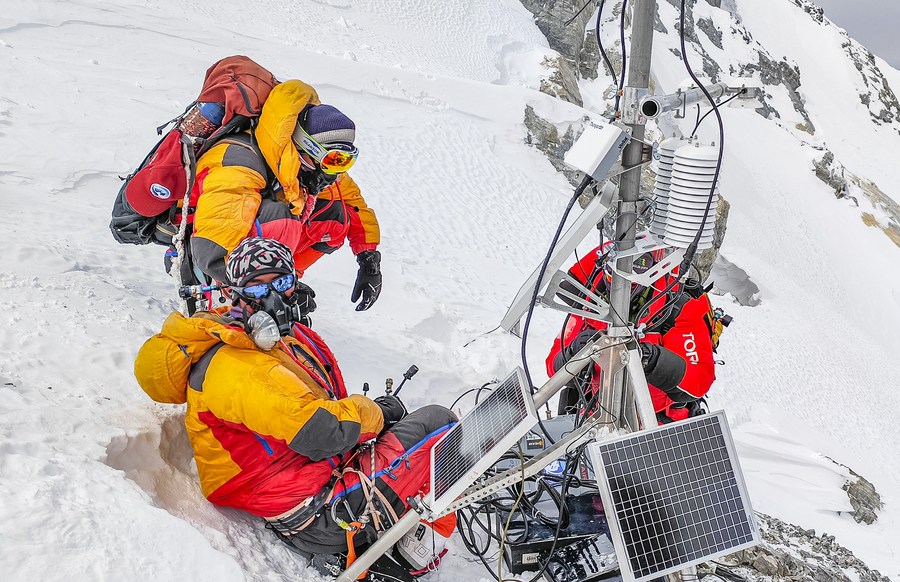 Members of a Chinese expedition team maintain and upgrade equipment at the 8,830-meter weather station on Mount Qomolangma, May 23, 2023. (Photo by Lhagba/Xinhua)