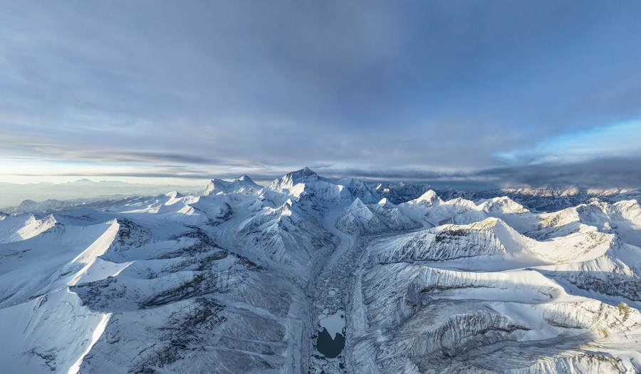 This aerial photo taken on May 23, 2023 shows a view of Mount Qomolangma. (Xinhua/Sun Fei)