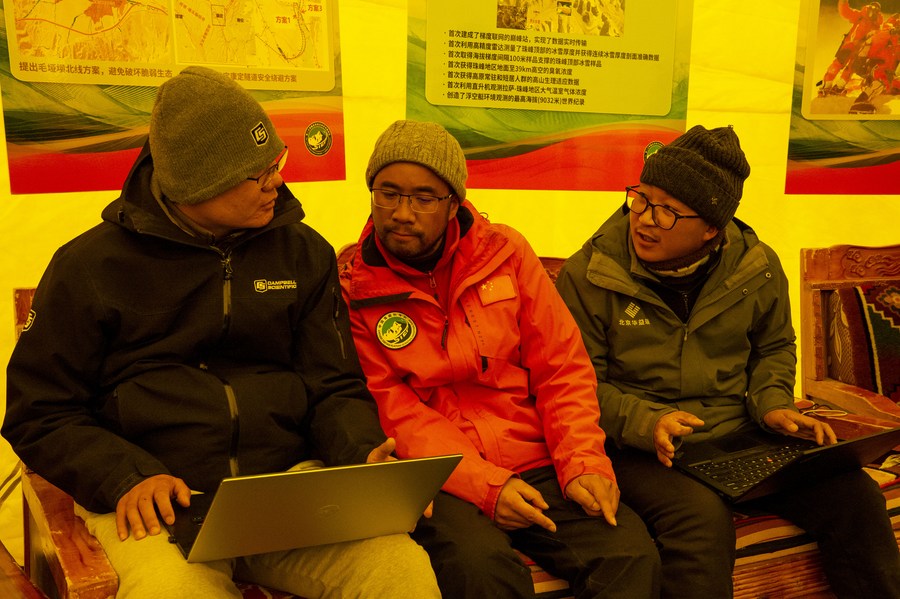 Scientific research members check data sent from the 8,830-meter weather station at the mountaineering base camp in the Qomolangma National Nature Reserve in southwest China's Tibet Autonomous Region, May 23, 2023. (Photo by Tenzin Norbu/Xinhua)