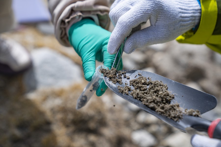 Scientific research members from Tibet University collect soil samples near the mountaineering base camp in the Qomolangma National Nature Reserve in southwest China's Tibet Autonomous Region, May 22, 2023. (Xinhua/Sun Fei)