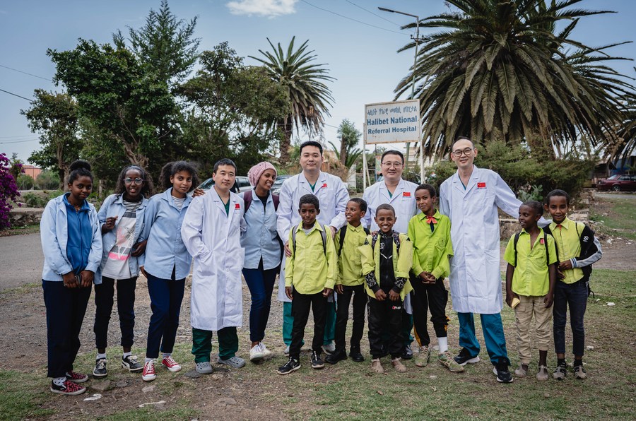 Members of the Chinese medical team pose for a group photo with local students at the gate of Halibet Hospital in Asmara, Eritrea, on May 9, 2023. Doctors of the 16th Chinese medical team to Eritrea have conducted 346 surgeries and 2,120 medical imaging examinations since they arrived in the East African country on April 17, 2023. Nearly 300 Chinese doctors have provided medical services in Eritrea since 1997. (Xinhua/Wang Guansen)