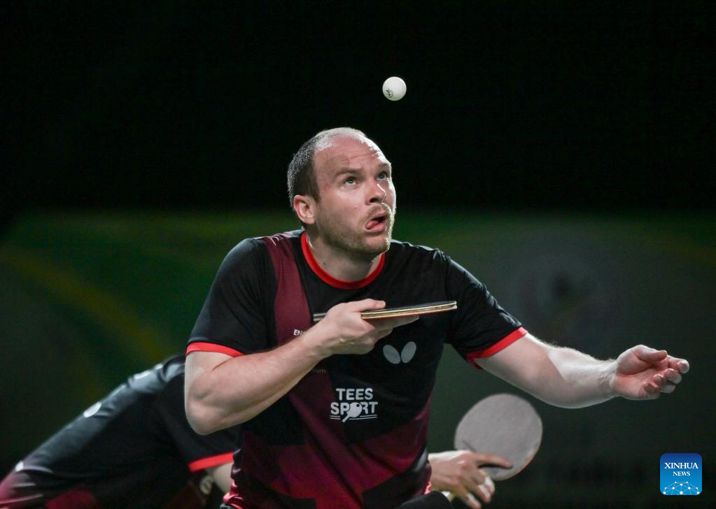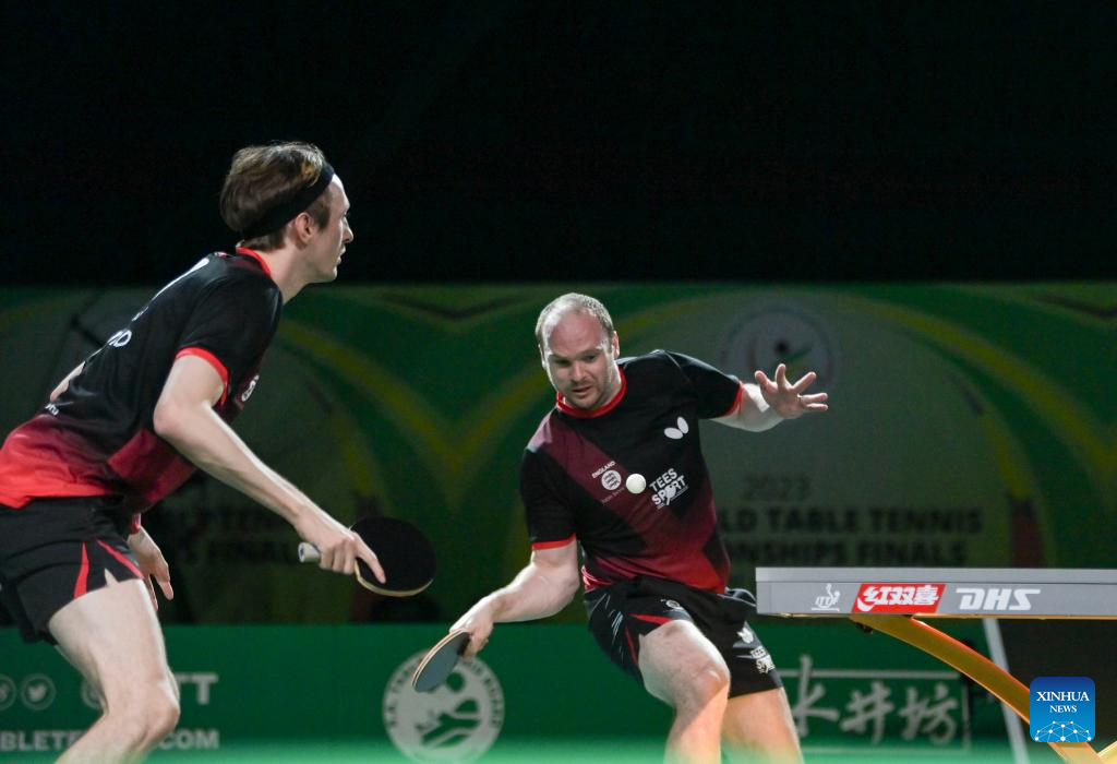 Liam Pitchford/Paul Drinkhall(R) of England compete during the men's doubles quarterfinal against Dimitrij Ovtcharov/Patrick Franziska of Germany at 2023 ITTF Table Tennis World Championships Finals in Durban, South Africa, May 25, 2023. (Xinhua/Han Xu)