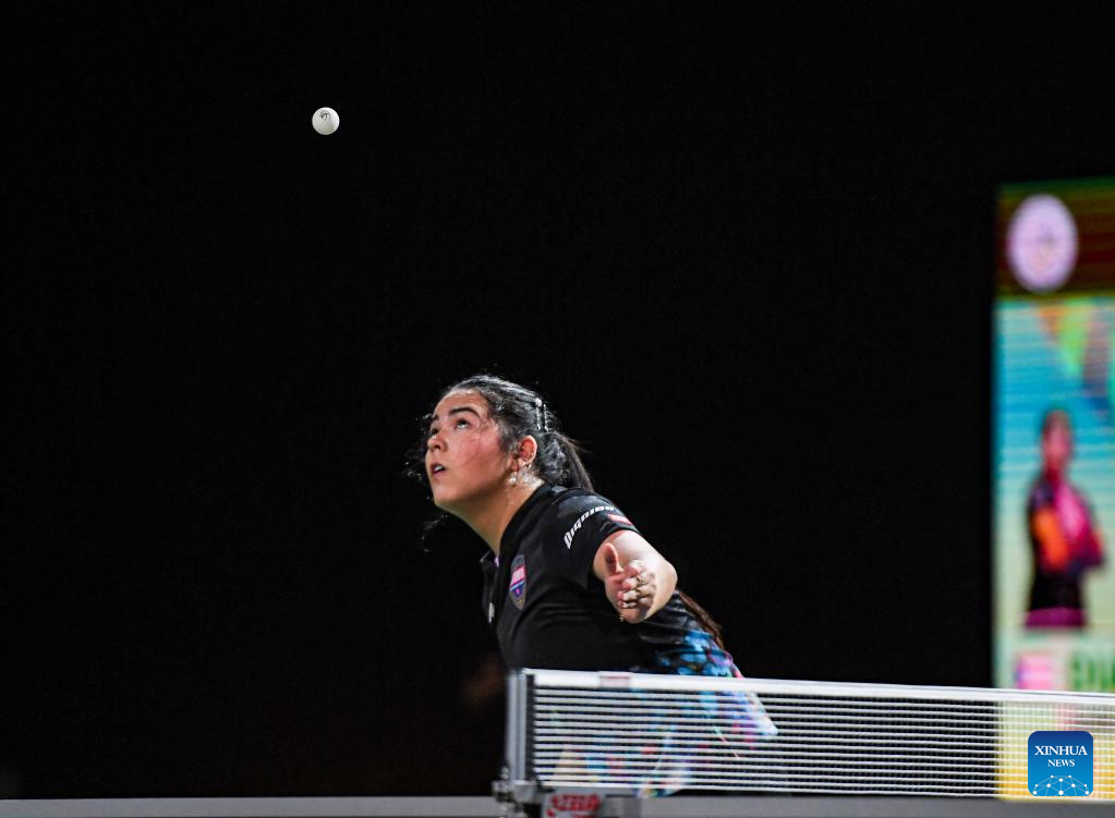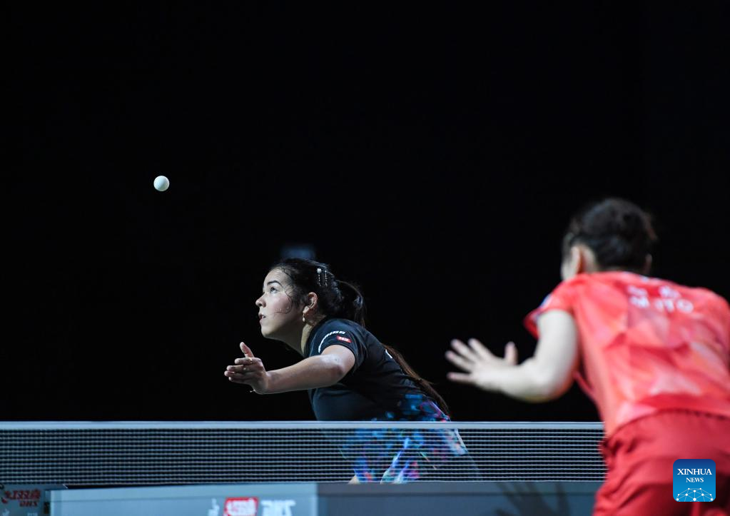 Adriana Diaz of Puerto Rico serves during the women's singles round of 16 match against Ito Mima of Japan at 2023 ITTF Table Tennis World Championships Finals in Durban, South Africa, May 25, 2023. (Xinhua/Li Yahui)