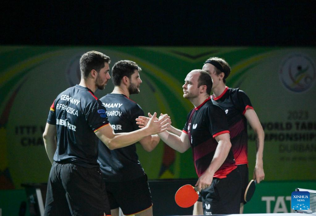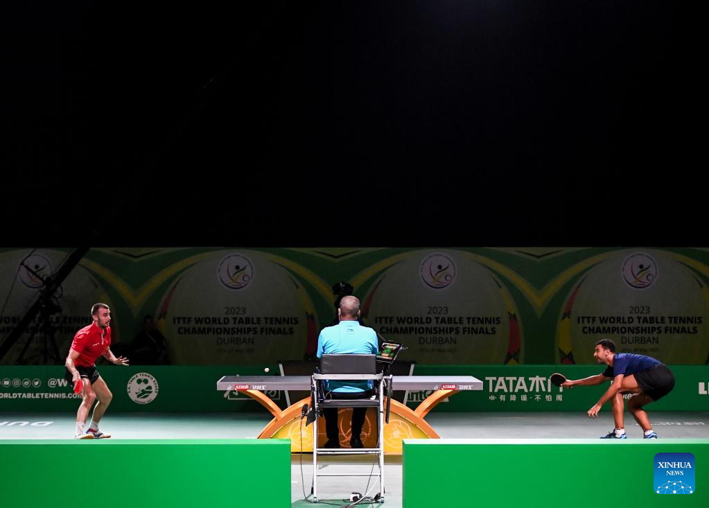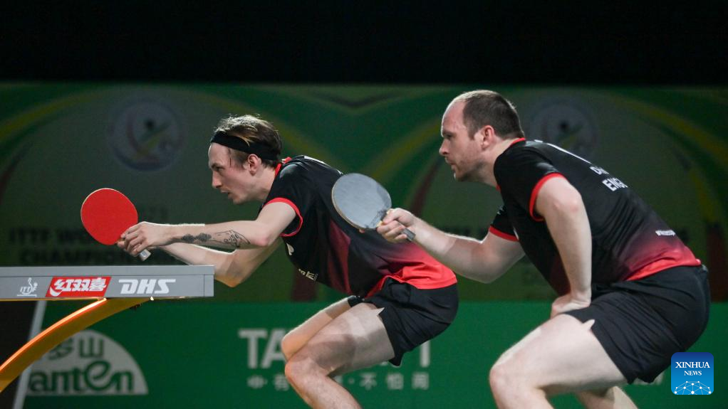 Dimitrij Ovtcharov(L)/Patrick Franziska of Germany compete during the men's doubles quarterfinal against Liam Pitchford/Paul Drinkhall of England at 2023 ITTF Table Tennis World Championships Finals in Durban, South Africa, May 25, 2023. (Xinhua/Han Xu)