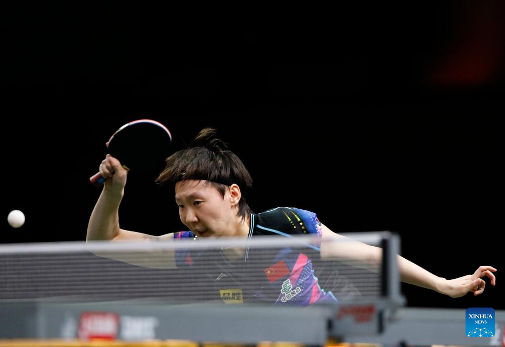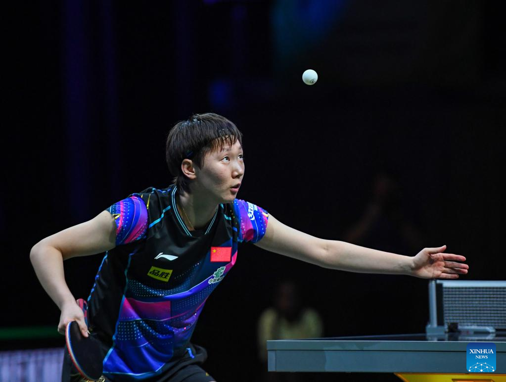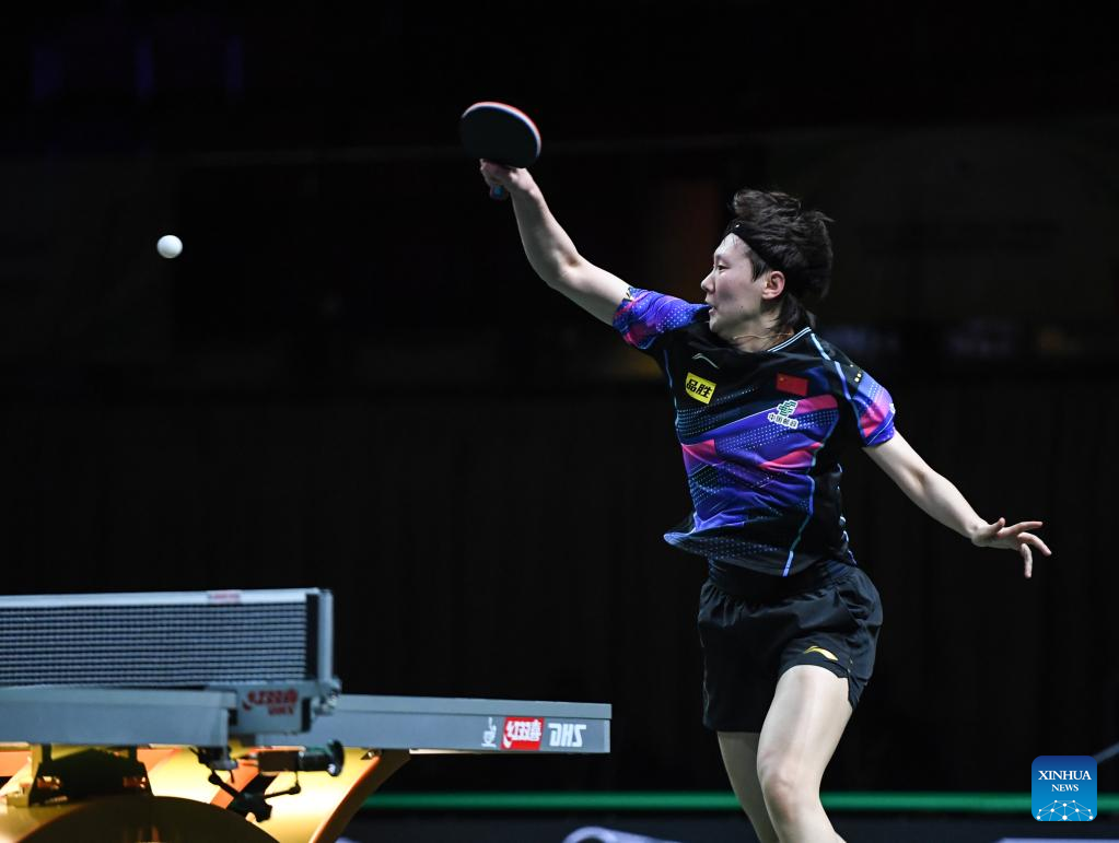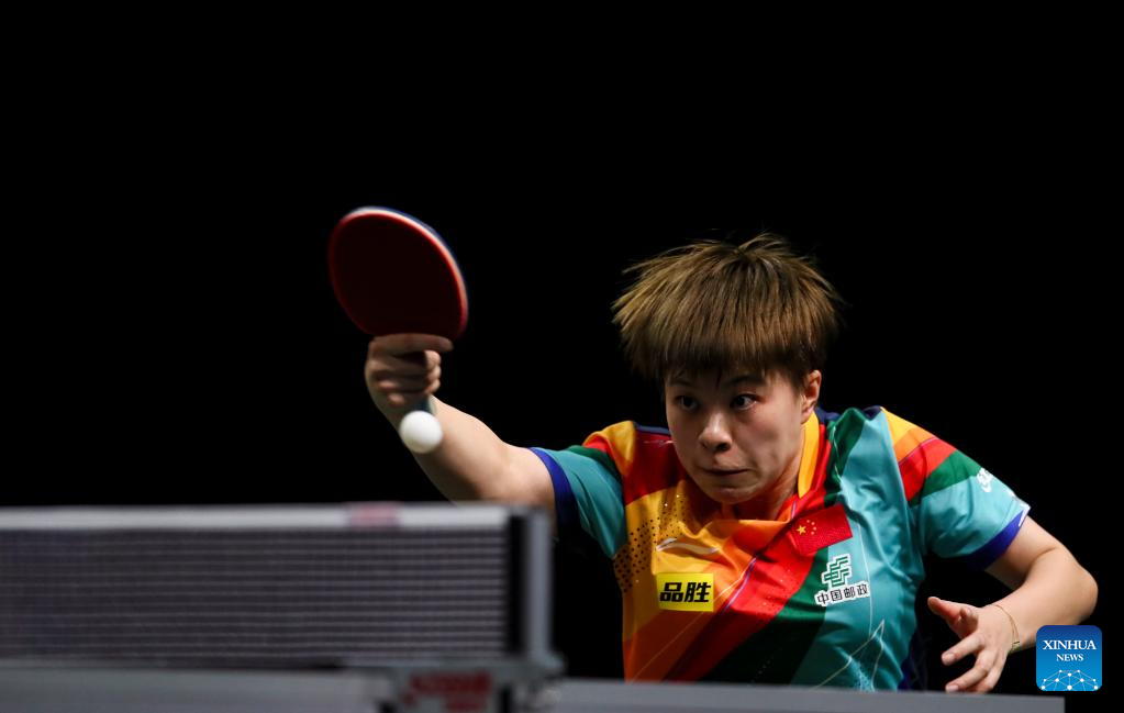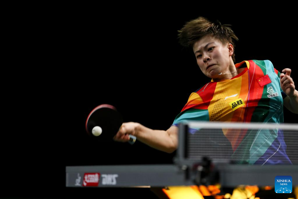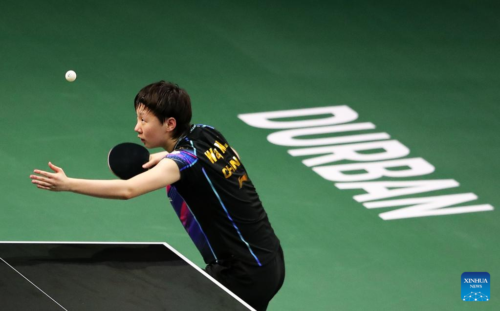Wang Manyu of China hits a return during the women's singles round of 16 match against Nina Mittelham of Germany at 2023 ITTF Table Tennis World Championships Finals in Durban, South Africa, May 25, 2023. (Xinhua/Wang Dongzhen)