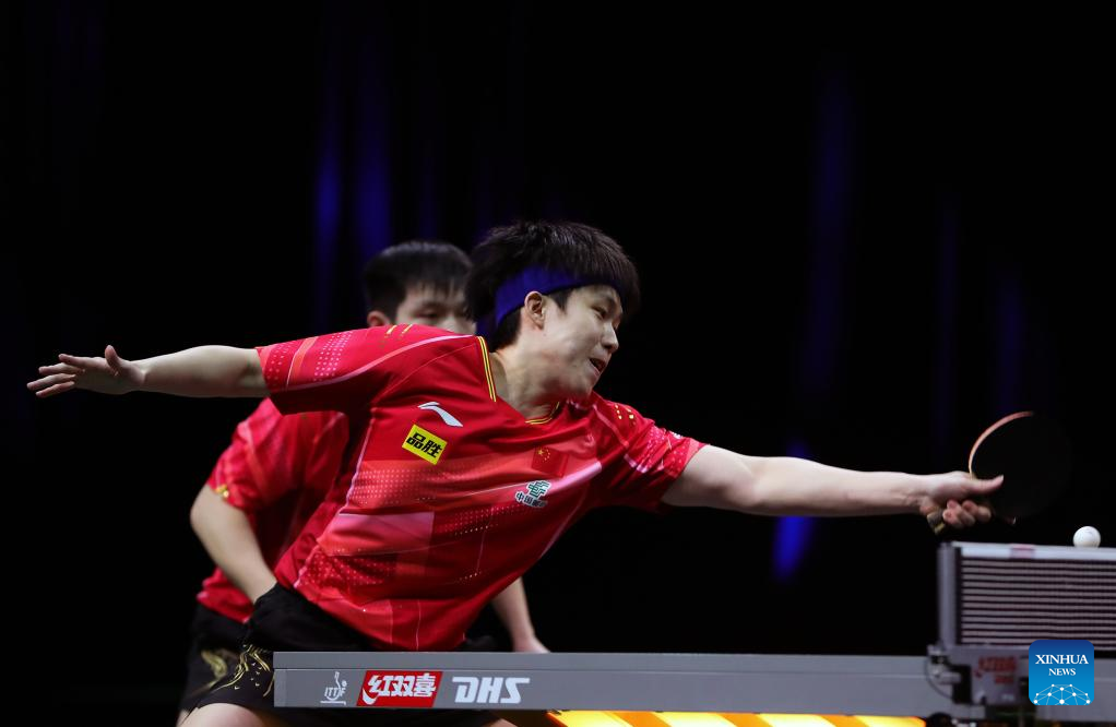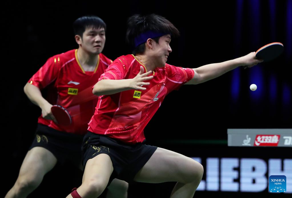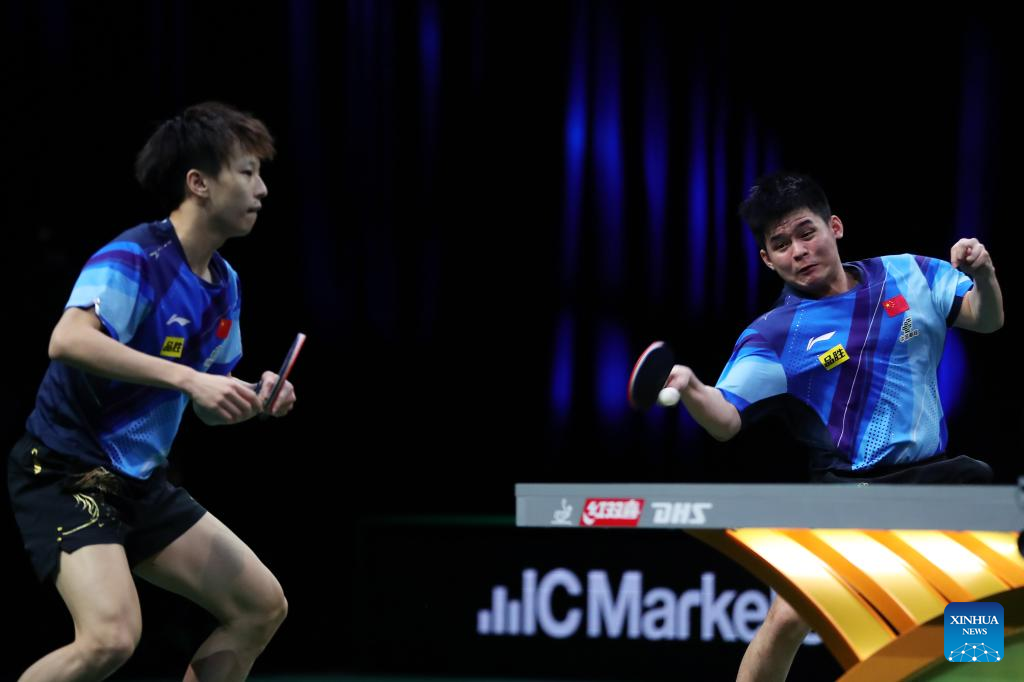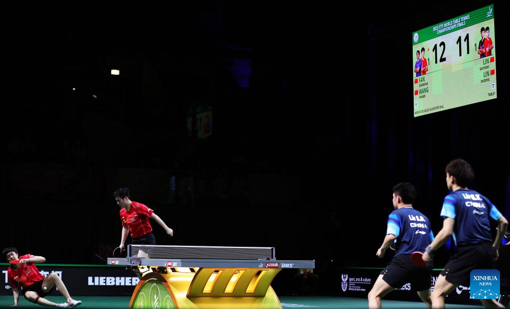 Fan Zhendong(R)/Wang Chuqin of China compete during the men's doubles quarterfinal against their teammates Lin Gaoyuan/Lin Shidong at 2023 ITTF Table Tennis World Championships Finals in Durban, South Africa, May 25, 2023. (Xinhua/Wang Dongzhen)