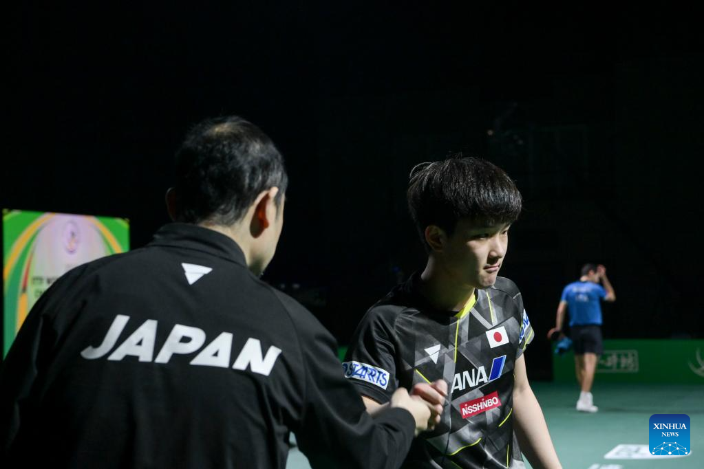 Harimoto Tomokazu (R) of Japan is seen after the men's singles round of 16 match against Mihai Bobocica of Italy at 2023 ITTF Table Tennis World Championships Finals in Durban, South Africa, May 25, 2023. (Xinhua/Han Xu)