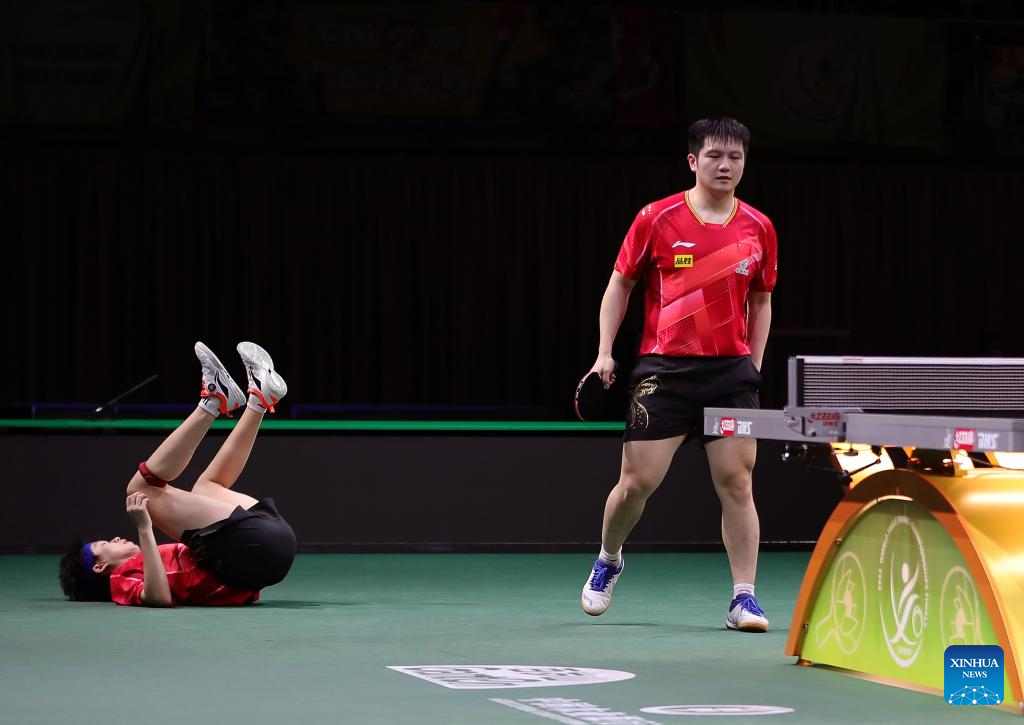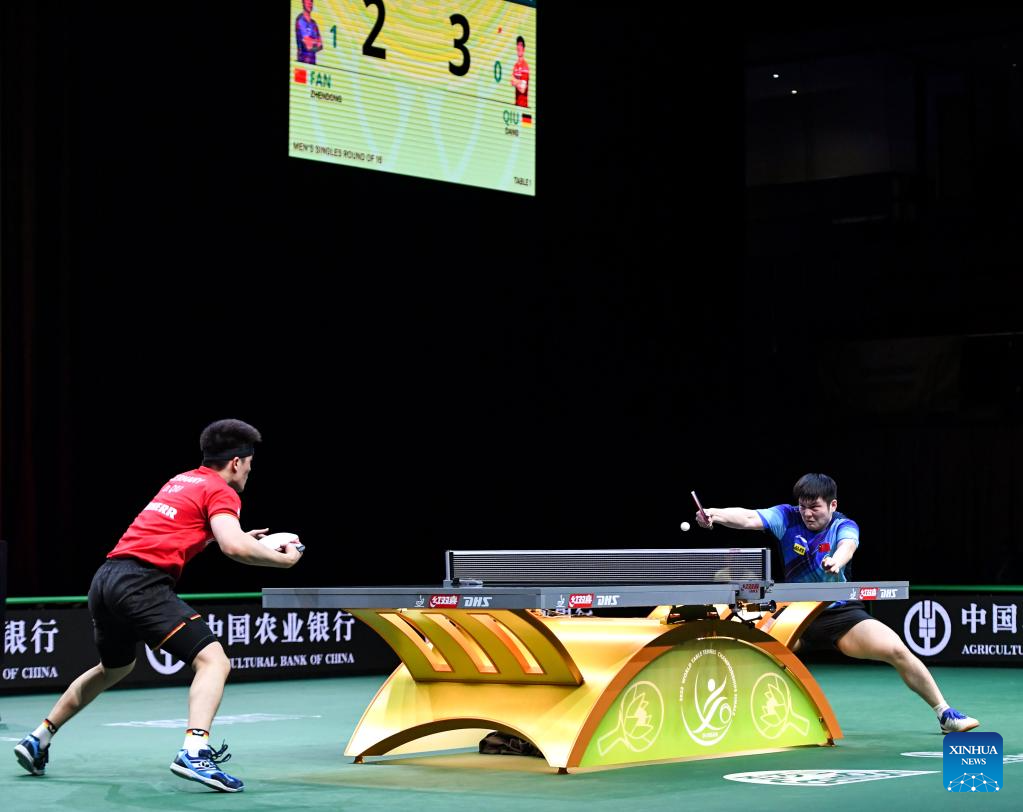 Fan Zhendong (R) of China hits a return during the men's singles round of 16 match against Qiu Dang of Germany at 2023 ITTF Table Tennis World Championships Finals in Durban, South Africa, May 25, 2023. (Xinhua/Li Yahui)