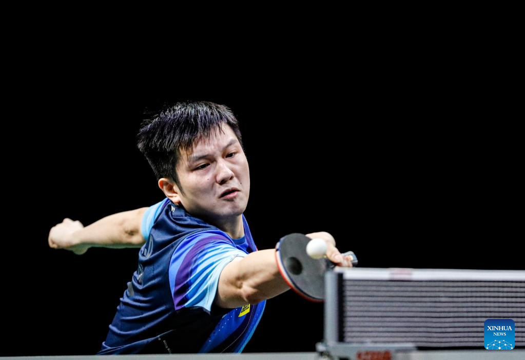 Fan Zhendong of China hits a return during the men's singles round of 16 match against Qiu Dang of Germany at 2023 ITTF Table Tennis World Championships Finals in Durban, South Africa, May 25, 2023. (Xinhua/Li Yahui)