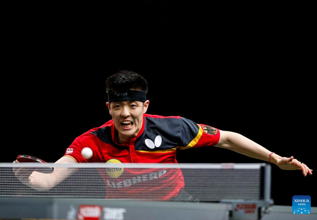 Qiu Dang of Germany hits a return during the men's singles round of 16 match against Fan Zhendong of China at 2023 ITTF Table Tennis World Championships Finals in Durban, South Africa, May 25, 2023. (Xinhua/Li Yahui)