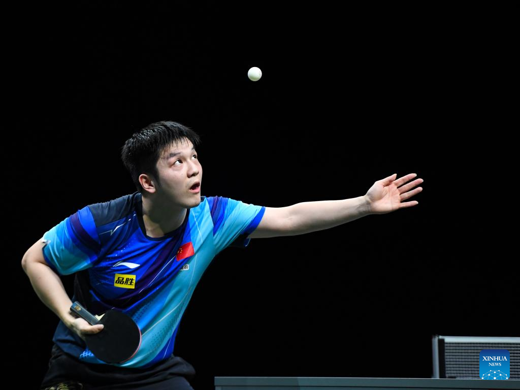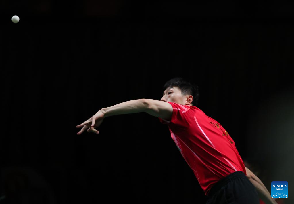 Fan Zhendong of China serves during the men's singles round of 16 match against Qiu Dang of Germany at 2023 ITTF Table Tennis World Championships Finals in Durban, South Africa, May 25, 2023. (Xinhua/Li Yahui)