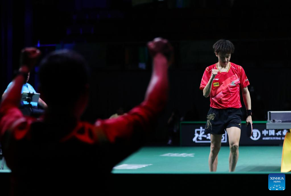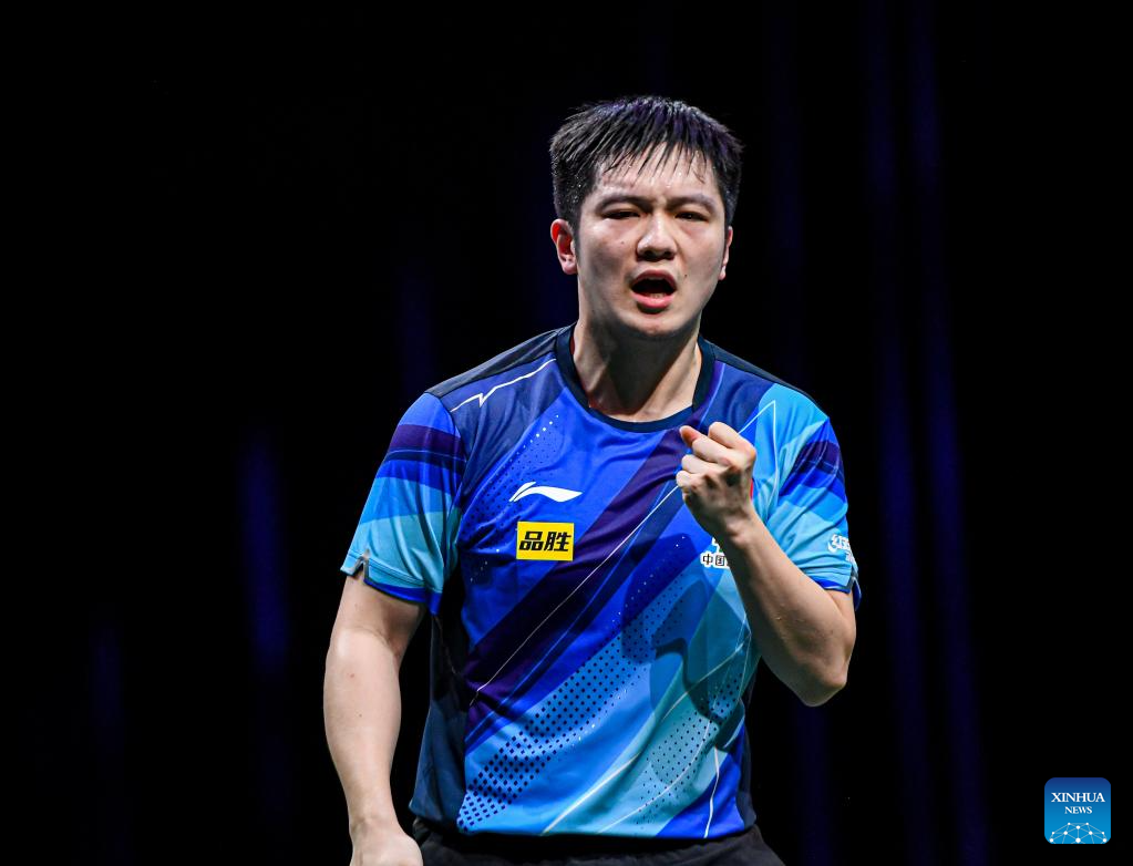 Fan Zhendong of China celebrates during the men's singles round of 16 match against Qiu Dang of Germany at 2023 ITTF Table Tennis World Championships Finals in Durban, South Africa, May 25, 2023. (Xinhua/Li Yahui)
