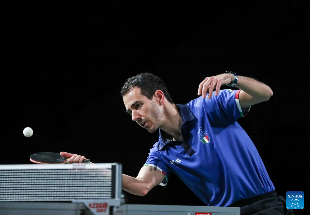 Mihai Bobocica of Italy hits a return during the men's singles round of 16 match against Harimoto Tomokazu of Japan at 2023 ITTF Table Tennis World Championships Finals in Durban, South Africa, May 25, 2023. (Xinhua/Han Xu)
