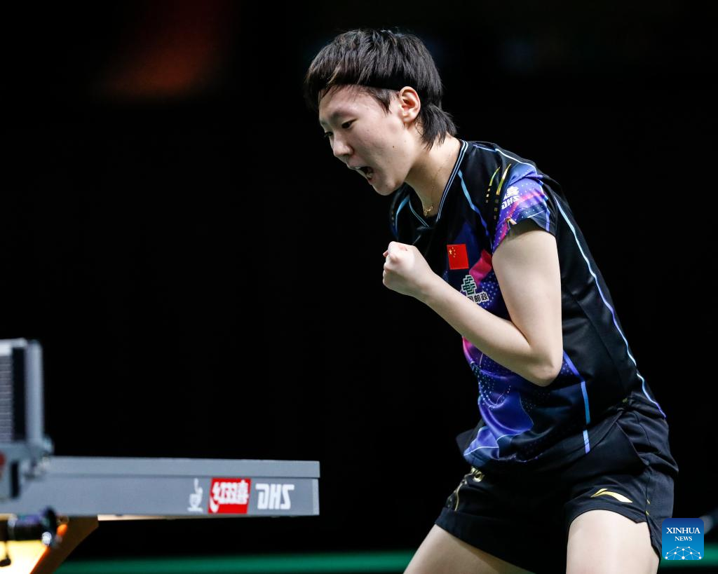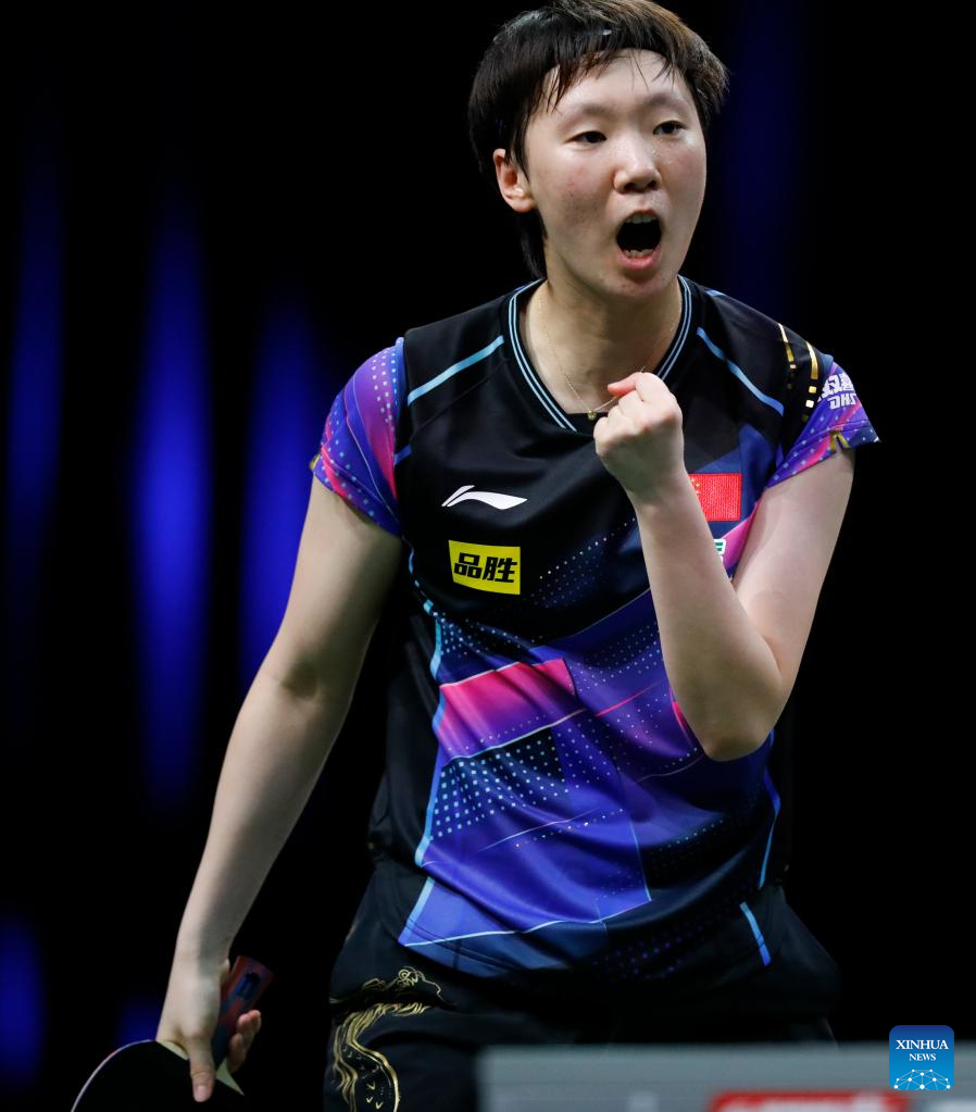 Wang Manyu of China celebrates during the women's singles round of 16 match against Nina Mittelham of Germany at 2023 ITTF Table Tennis World Championships Finals in Durban, South Africa, May 25, 2023. (Xinhua/Li Yahui)