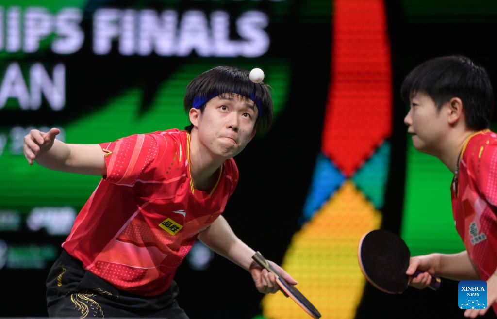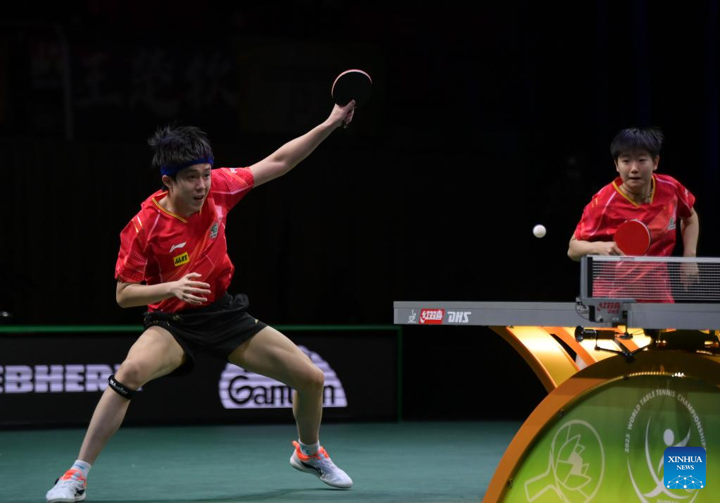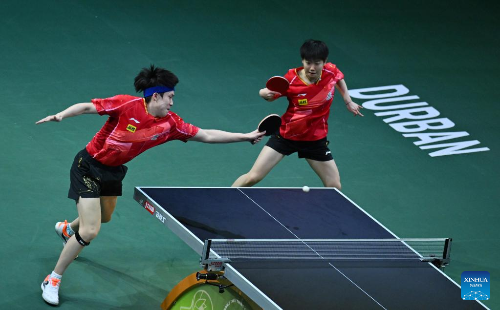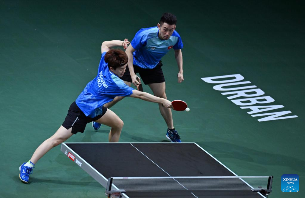 Wang Chuqin (L)/Sun Yingsha compete during the mixed doubles semifinal between Wang Chuqin/Sun Yingsha of China and Wong Chun Ting/Doo Hoi Kem of China's Hong Kong at 2023 ITTF Table Tennis World Championships Finals in Durban, South Africa, May 25, 2023. (Xinhua/Han Xu)