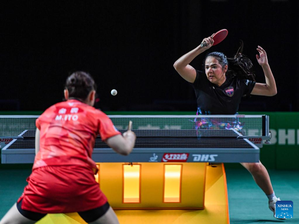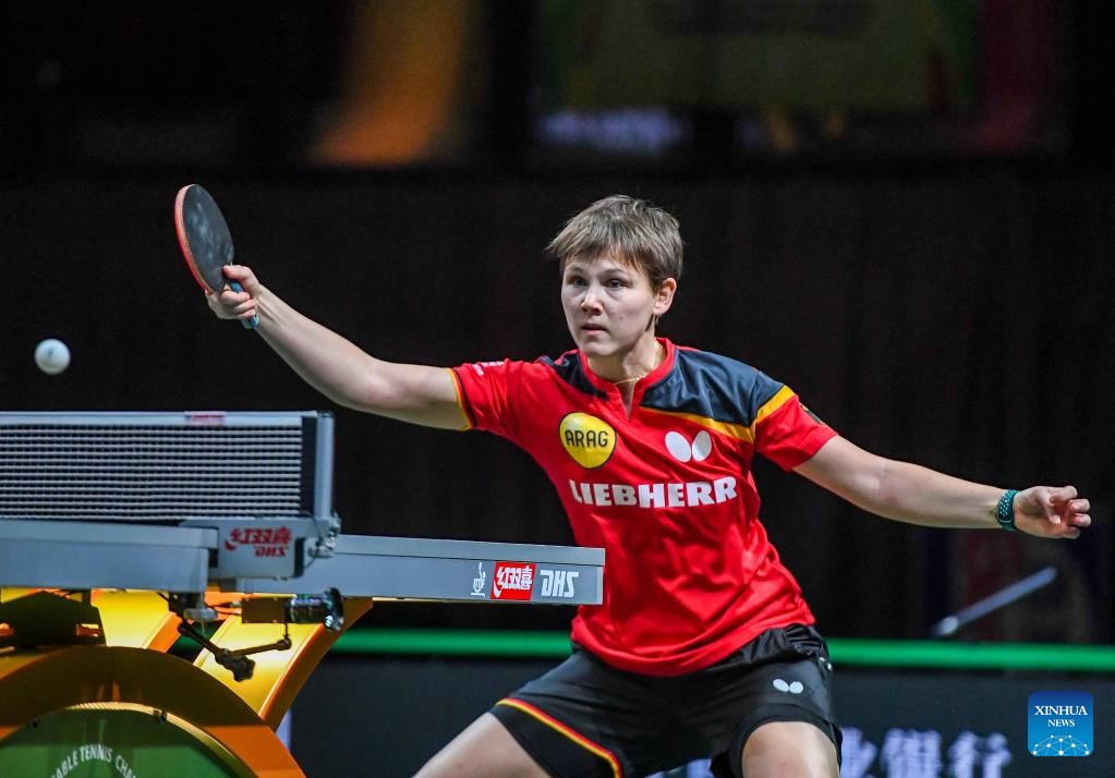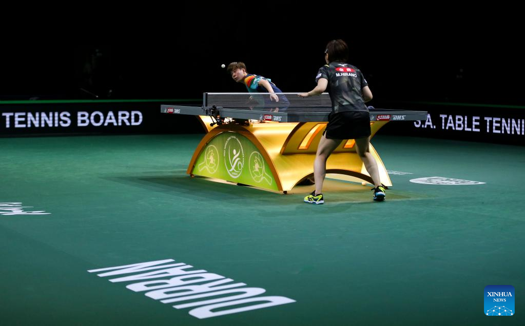 Nina Mittelham of Germany hits a return during the women's singles round of 16 match against Wang Manyu of China at 2023 ITTF Table Tennis World Championships Finals in Durban, South Africa, May 25, 2023. (Xinhua/Li Yahui)