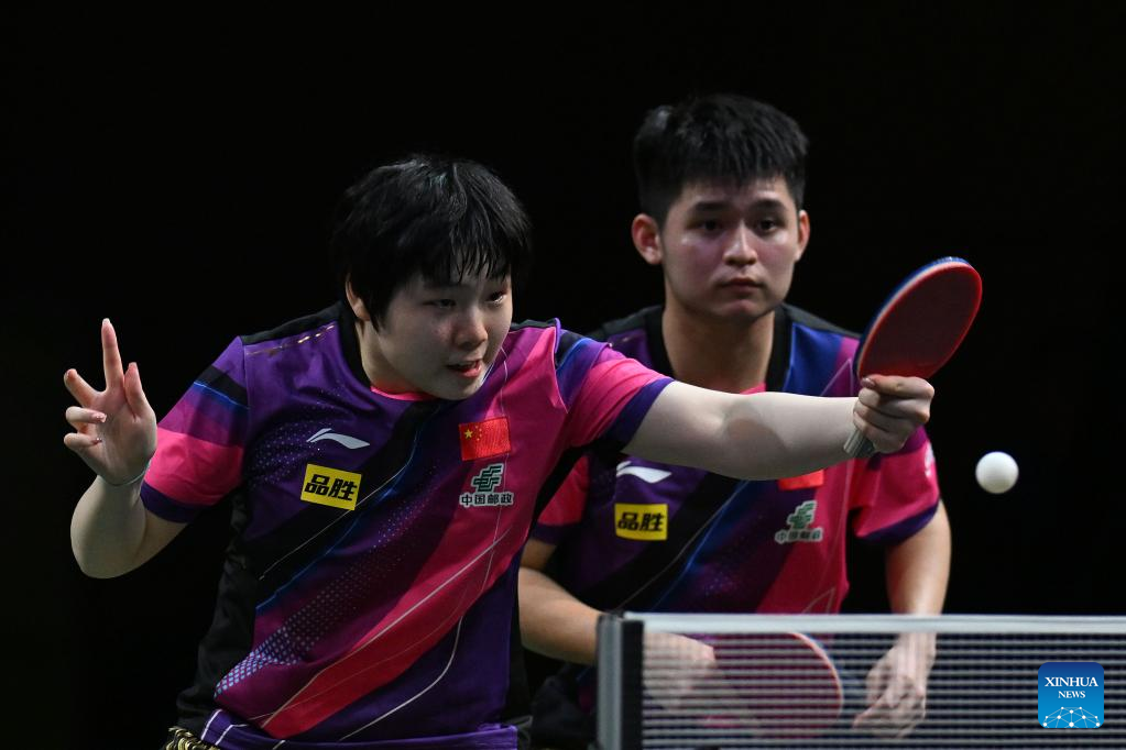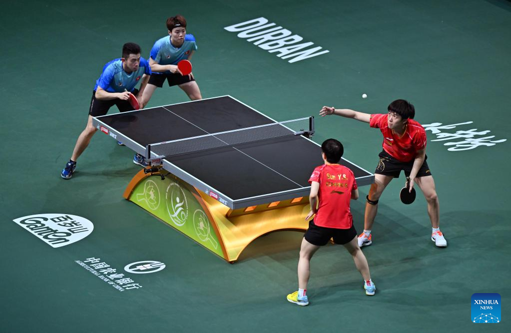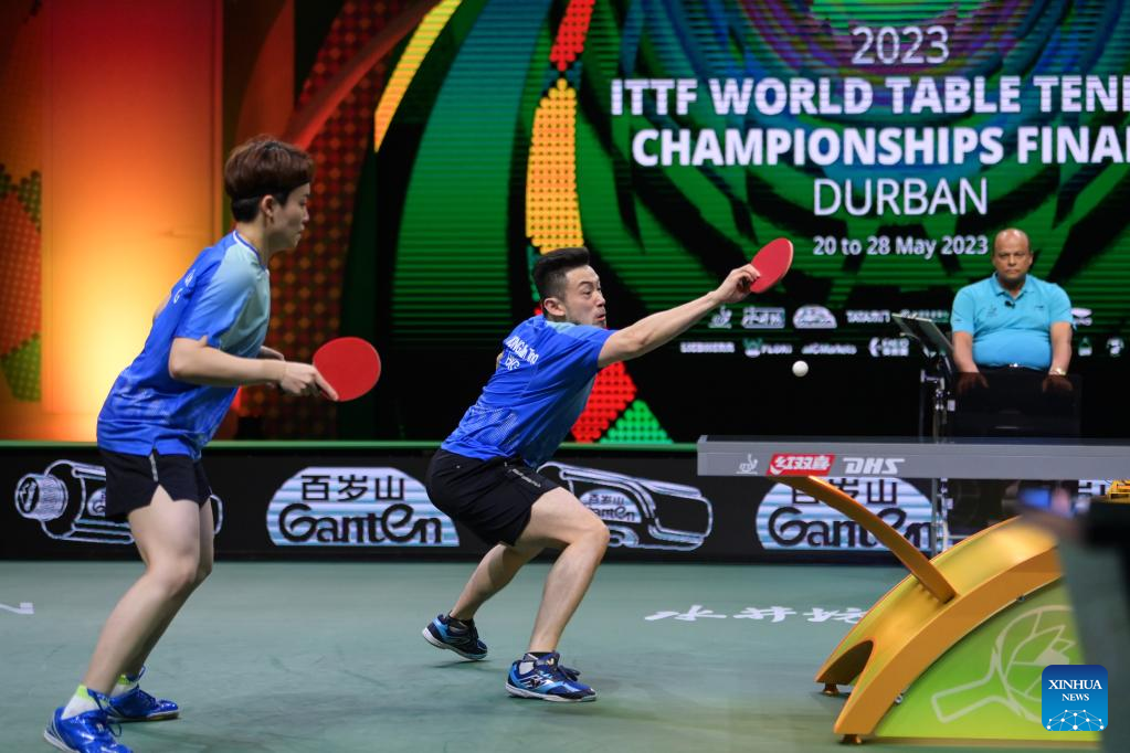 Wang Chuqin (L)/Sun Yingsha compete during the mixed doubles semifinal between Wang Chuqin/Sun Yingsha of China and Wong Chun Ting/Doo Hoi Kem of China's Hong Kong at 2023 ITTF Table Tennis World Championships Finals in Durban, South Africa, May 25, 2023. (Xinhua/Tao Xiyi)