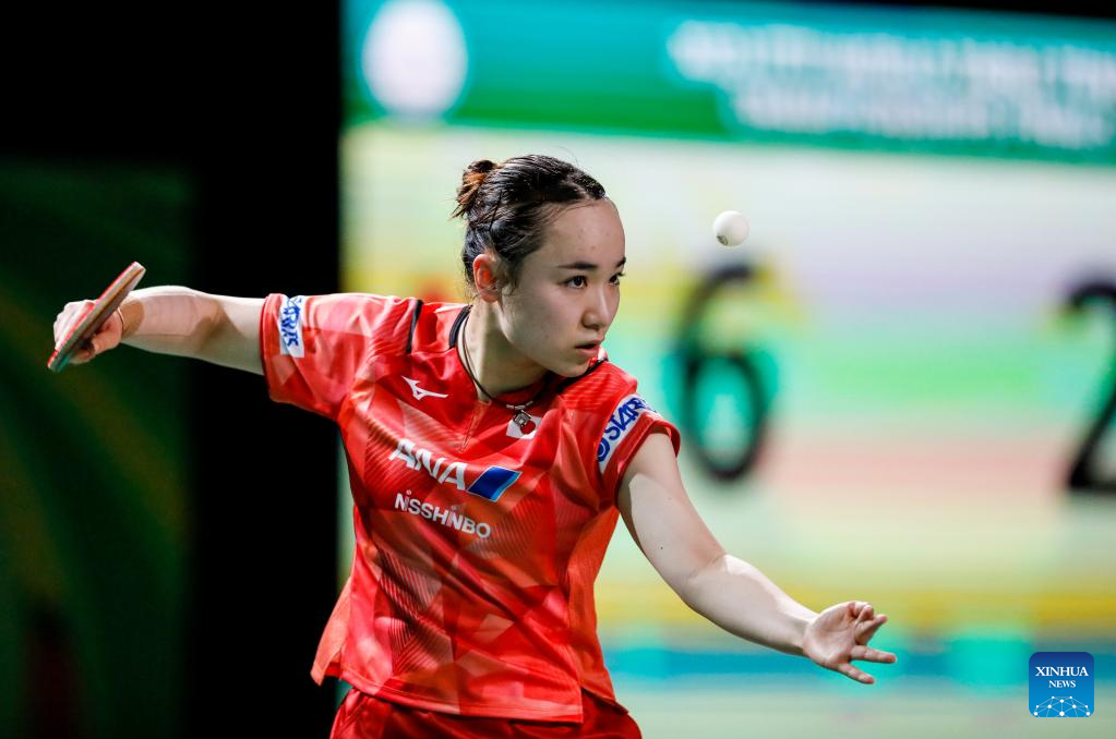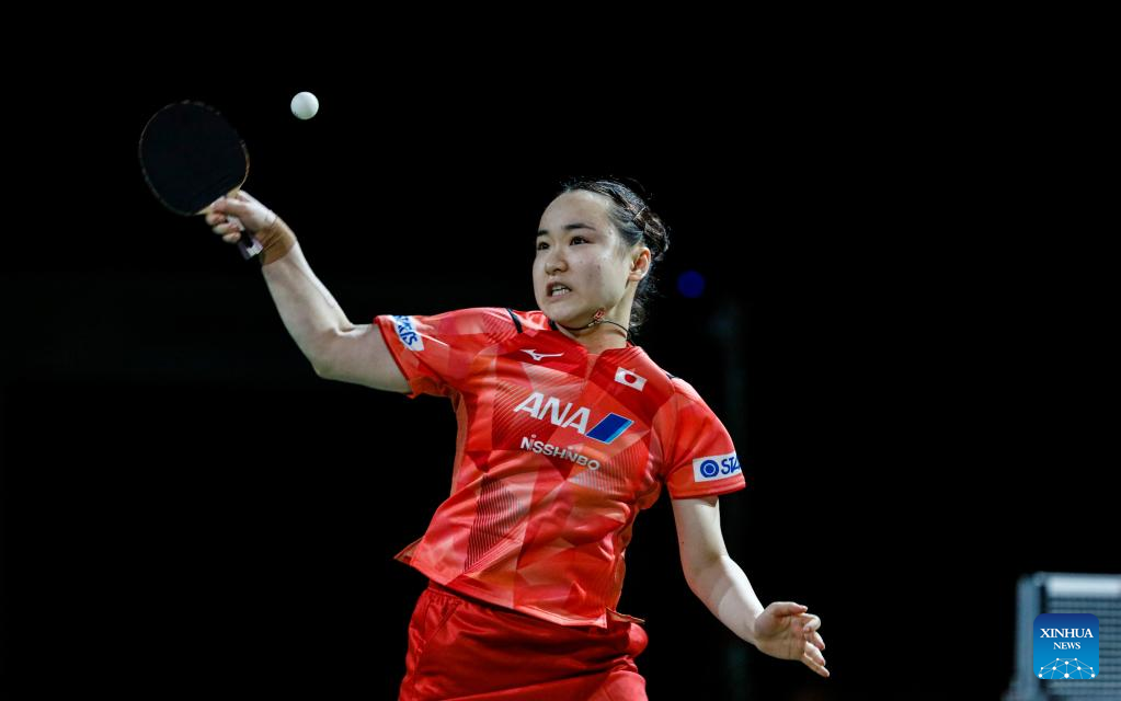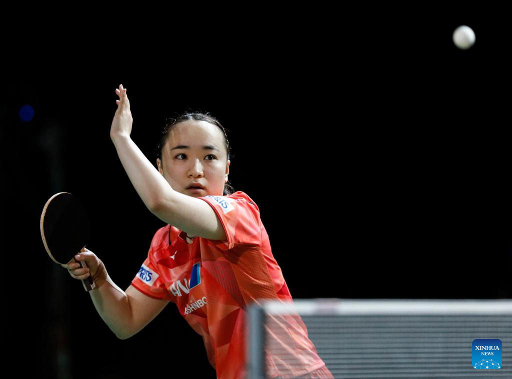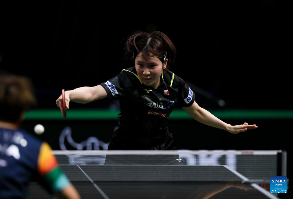 Ito Mima of Japan hits a return during the women's singles round of 16 match against Adriana Diaz of Puerto Rico at 2023 ITTF Table Tennis World Championships Finals in Durban, South Africa, May 25, 2023. (Xinhua/Li Yahui)